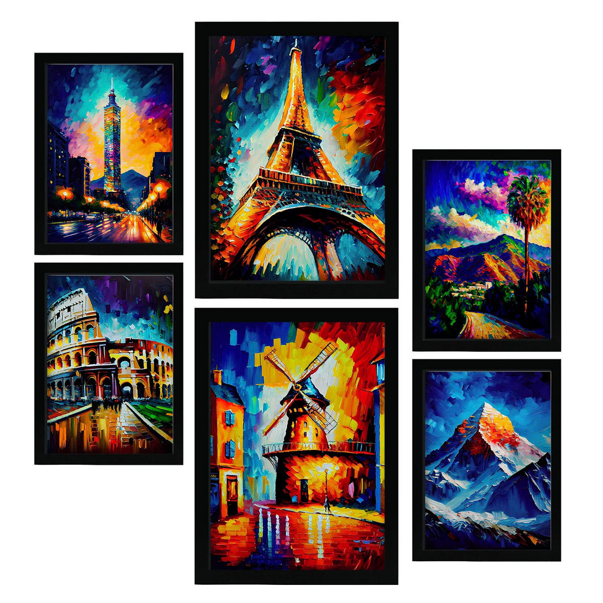 POSTER Set Mit 6 Hoch Aufragend Im Ölgemälde Stil A3 & A4 Schwarzer Rahmen - Schwarz, Papier (29/3cm) - Nacnic