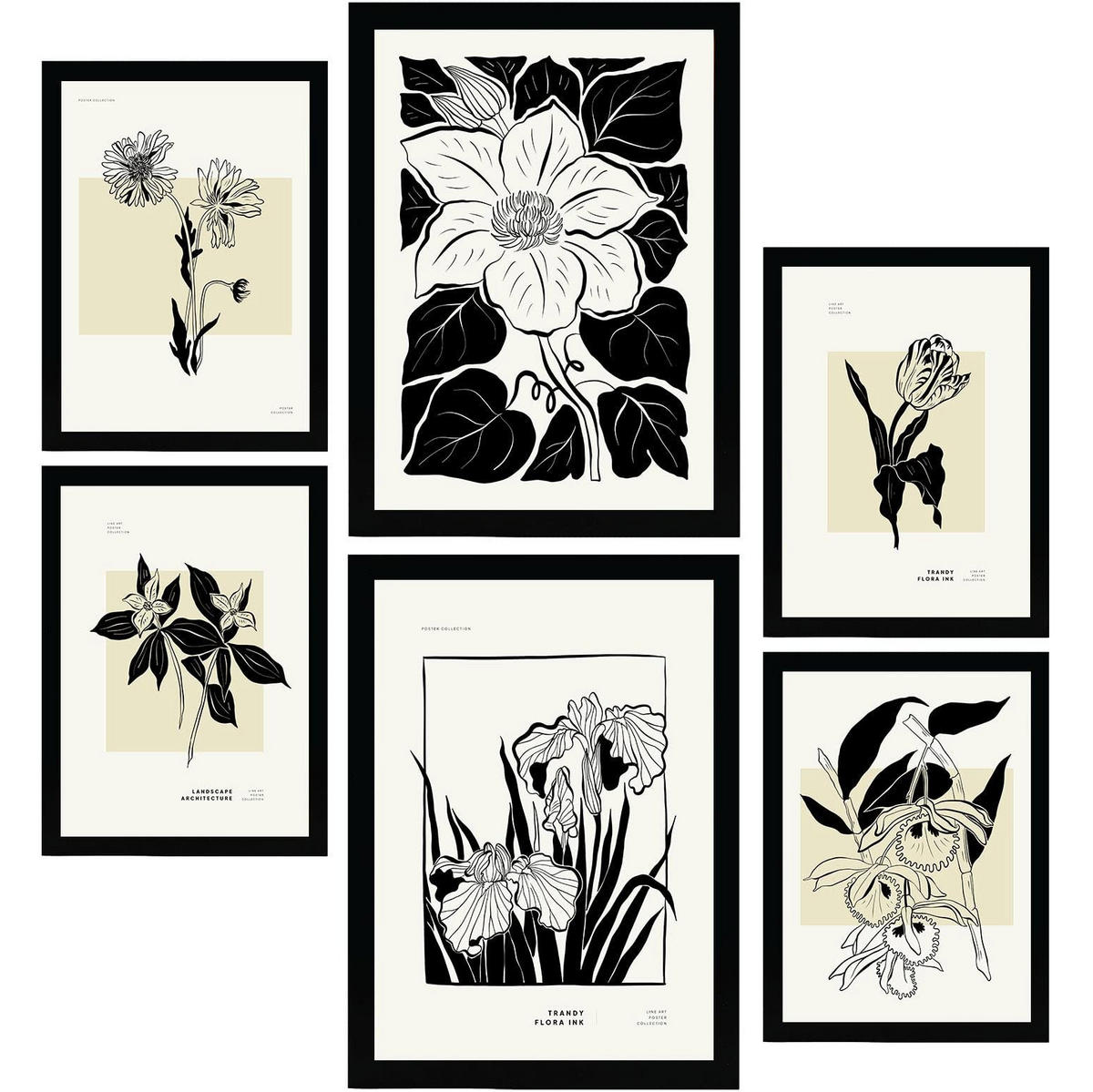 POSTER Set Mit 6 In Schwarzer Tinte Blumen Kunstdrucke Im Skizzenstil Für Innenarchitektur A3 & A4 Schwarzer Rahmen - Schwarz, Papier (29/3cm) - NacnicNacnic