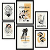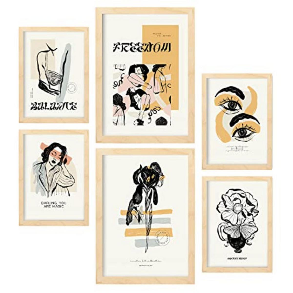 POSTER Set Mit 6 In Schwarzer Tinte Freiheit Kunstdrucke Im Skizzenstil Für Innenarchitektur A3 & A4 Rahmen Aus Hellem Holz - Beige, Papier (29/3cm) - NacnicNacnic