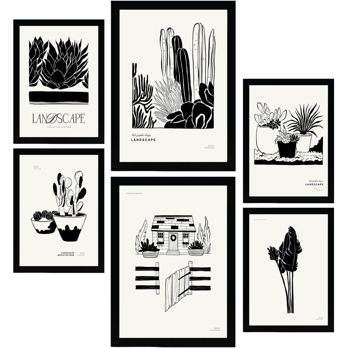 POSTER Set Mit 6 In Schwarzer Tinte Hinterhof Künstlerische Und Abstrakte Drucke Für Innenarchitektur A3 & A4 Schwarzer Rahmen - Schwarz, Papier (29/3cm) - Nacnic