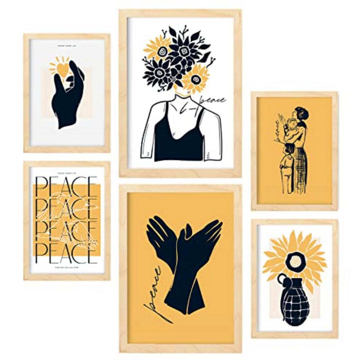 POSTER Set Mit 6 In Schwarzer Tinte Liebe Machen, Nicht Krieg Kunstdrucke Von Meer Und Ozean Für Innenarchitektur A3 & A4 Rahmen Aus Hellem Holz - Beige, Papier (29/3cm) - Nacnic