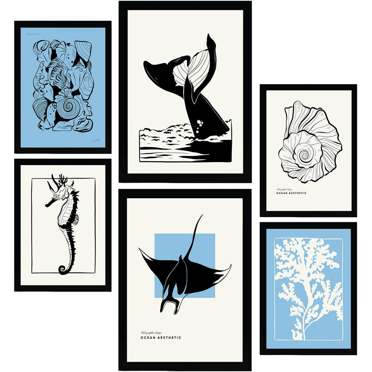 POSTER Set Mit 6 In Schwarzer Tinte Stachelrochen Und Wal Kunstdrucke Von Meer Und Ozean Für Innenarchitektur A3 & A4 Schwarzer Rahmen - Schwarz, Papier (29/3cm) - NacnicNacnic
