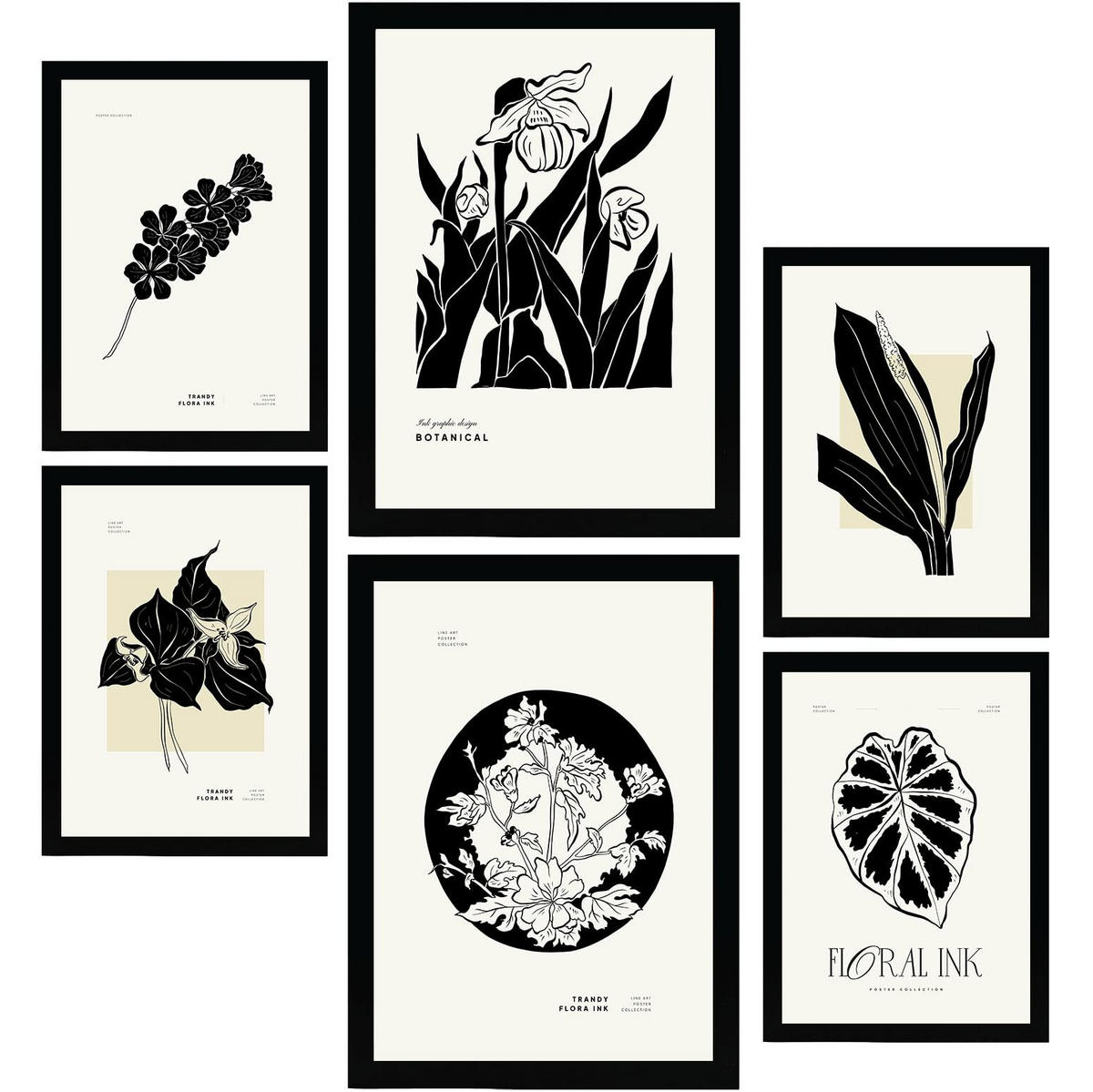 POSTER Set Mit 6 In Schwarzer Tinte Tropische Tinten Kunstdrucke Im Skizzenstil Für Innenarchitektur A3 & A4 Schwarzer Rahmen - Schwarz, Papier (29/3cm) - NacnicNacnic