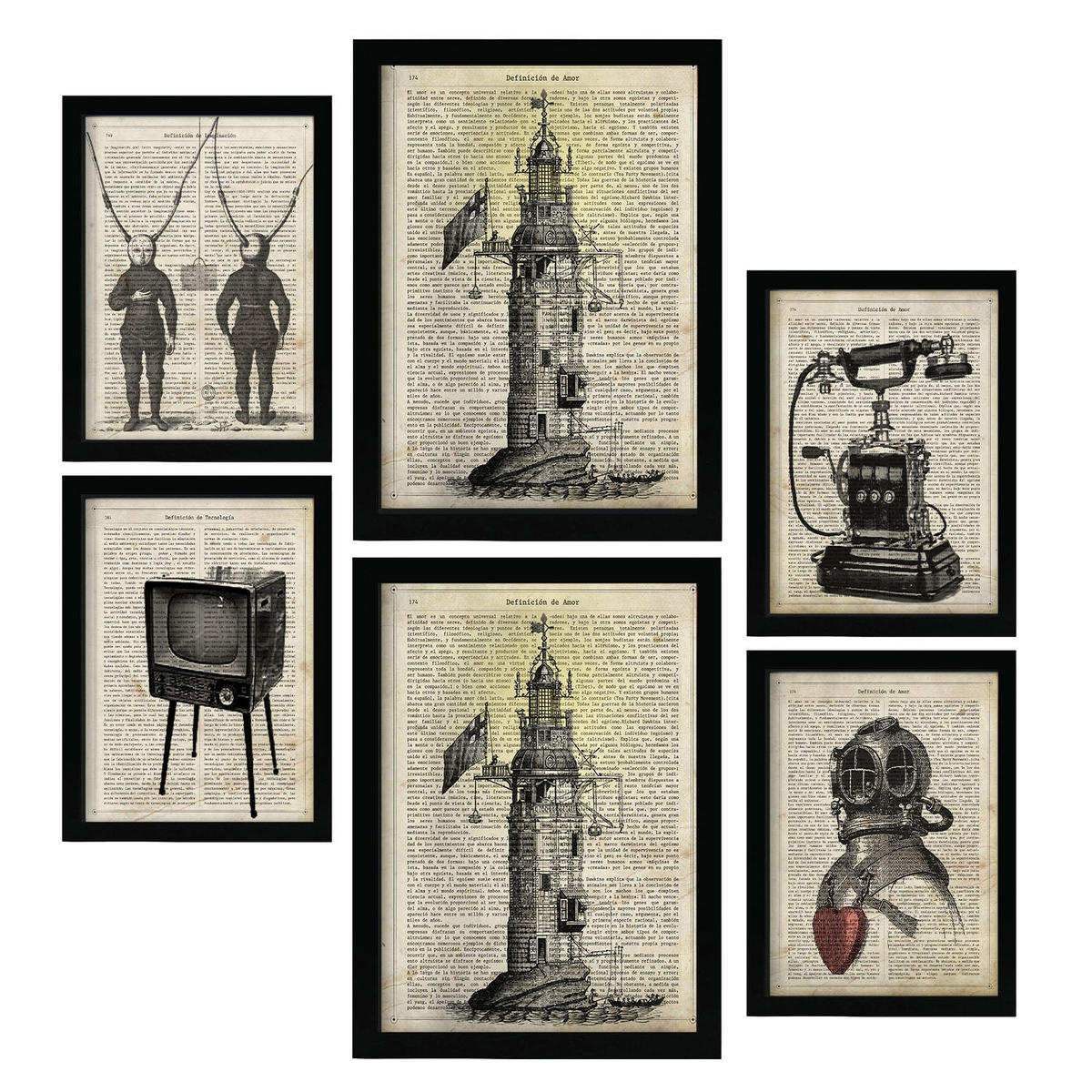 Nacnic POSTER Set Mit 6 Jahrgang Vintage Papier Plakate Mit Enzyklopädie Revolutionäre Erfindungen Aus Dem Letzten Jahrhundert A3 & A4 Schwarzer Rahmen