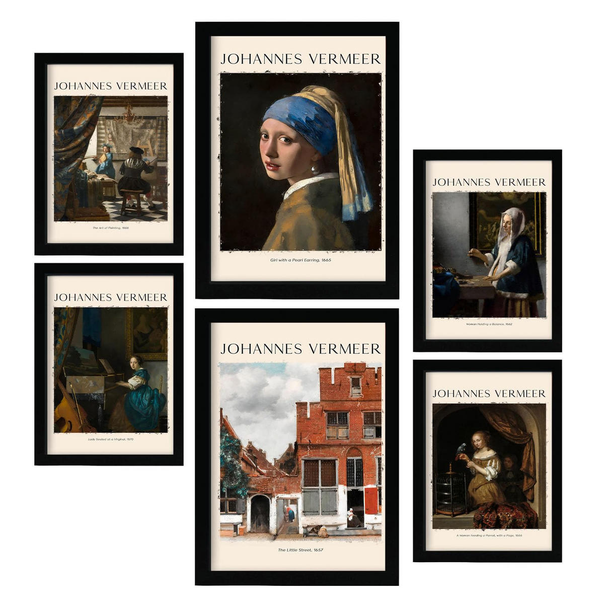 POSTER Set Mit 6 Johannes Vermeer Sammlung A3 & A4 Schwarzer Rahmen - Schwarz, Papier (29/3cm) - NacnicNacnic