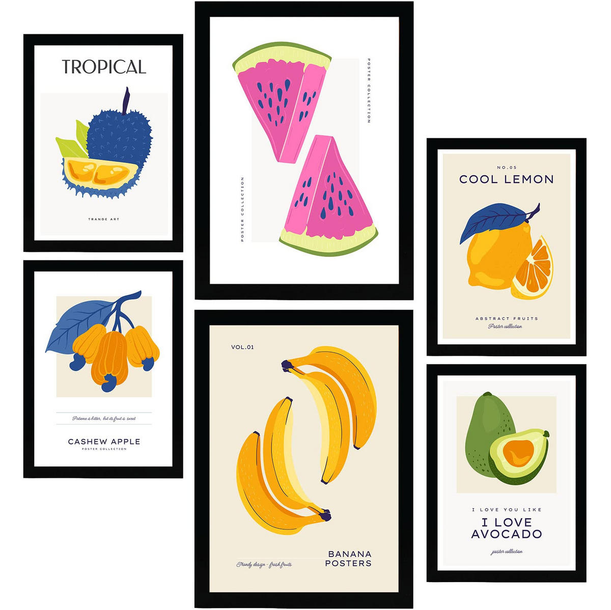 POSTER Set Mit 6 Lebensmittel Und Ernährungs Bunte Früchte Natur Und Ernährungs Für Innenarchitektur A3 & A4 Schwarzer Rahmen - Schwarz, Papier (29/3cm) - NacnicNacnic