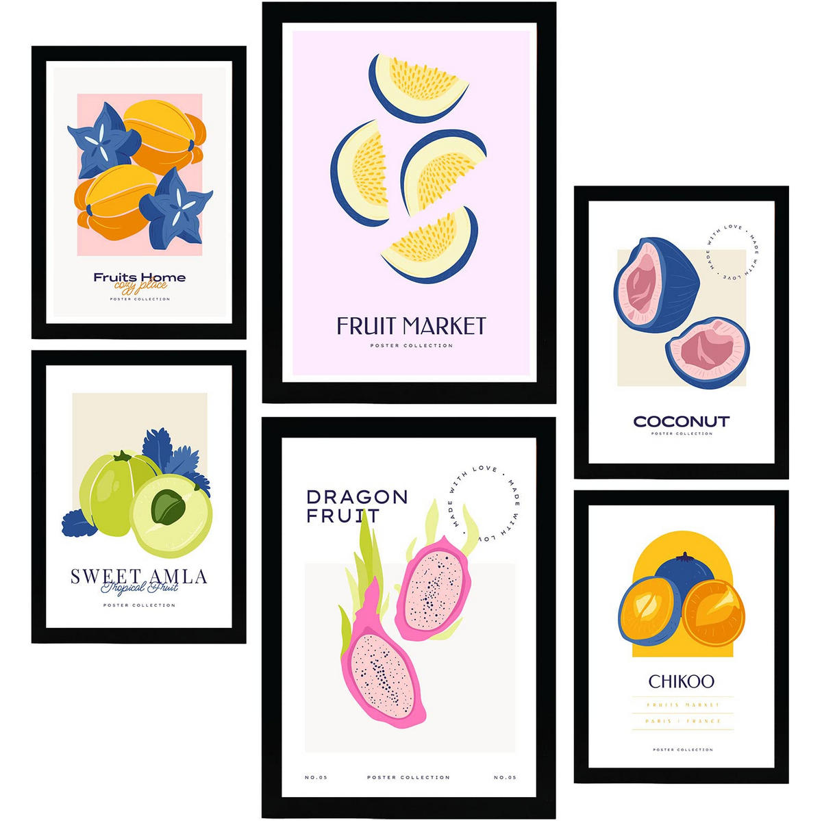 POSTER Set Mit 6 Lebensmittel Und Ernährungs Seltene Früchte Natur Und Ernährungs Für Innenarchitektur A3 & A4 Schwarzer Rahmen - Schwarz, Papier (29/3cm) - NacnicNacnic