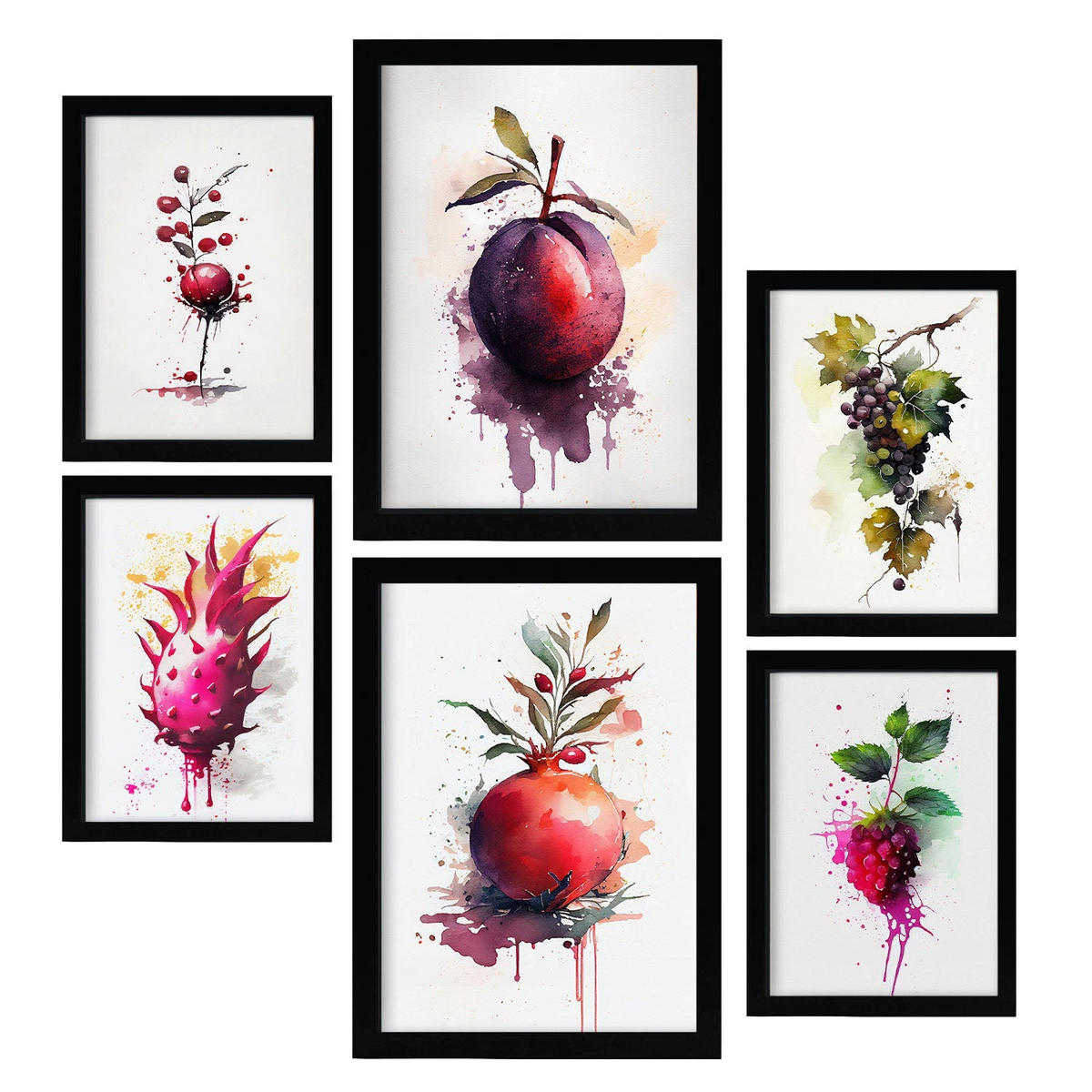 POSTER Set Mit 6 Lila Früchte Plakate Von Obst Gemüse & Gesunden Lebensmitteln Im Aquarell Kunst Auf Reinweißen Hintergründen A3 & A4 Schwarzer Rahmen - Schwarz, Papier (29/3cm) - NacnicNacnic