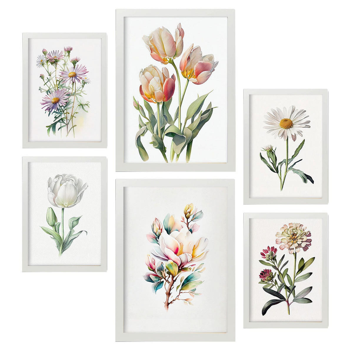 POSTER Set Mit 6 Pastellblumen Vollfarbige Natur Und Botanikdrucke Mit Blumenmotiven Auf Reinweißen Hintergründen A3 & A4 Weißer Rahmen - Weiß, Papier (29/3cm) - NacnicNacnic