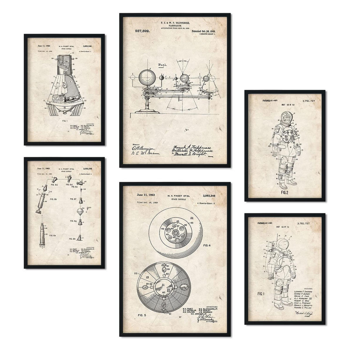 Nacnic POSTER Set Mit 6 Plakaten Mit Astronaut Patenten Im Vintage Stil A3 & A4 Schwarzer Rahmen
