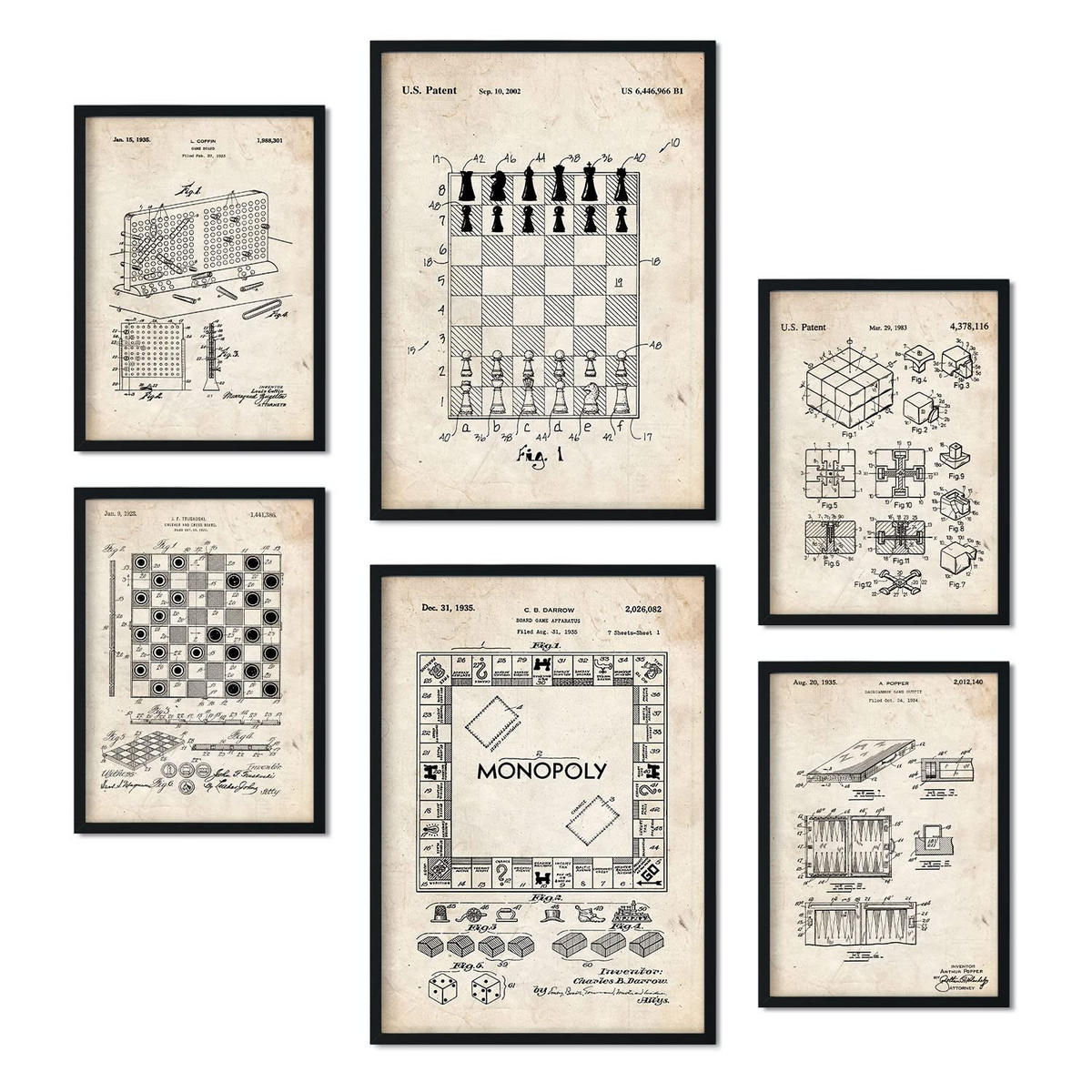 POSTER Set Mit 6 Plakaten Mit Brettspiel Patenten Im Vintage Stil A3 & A4 Schwarzer Rahmen - Schwarz, Papier (29/3cm) - NacnicNacnic