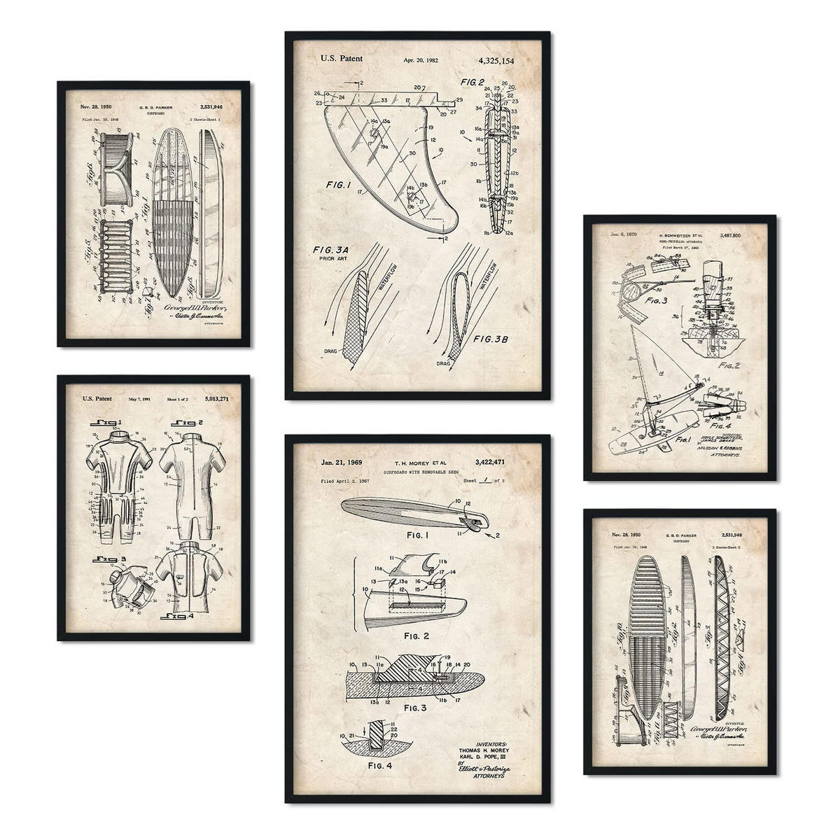 Nacnic POSTER Set Mit 6 Plakaten Mit Surfen Patenten Im Vintage Stil A3 & A4 Schwarzer Rahmen