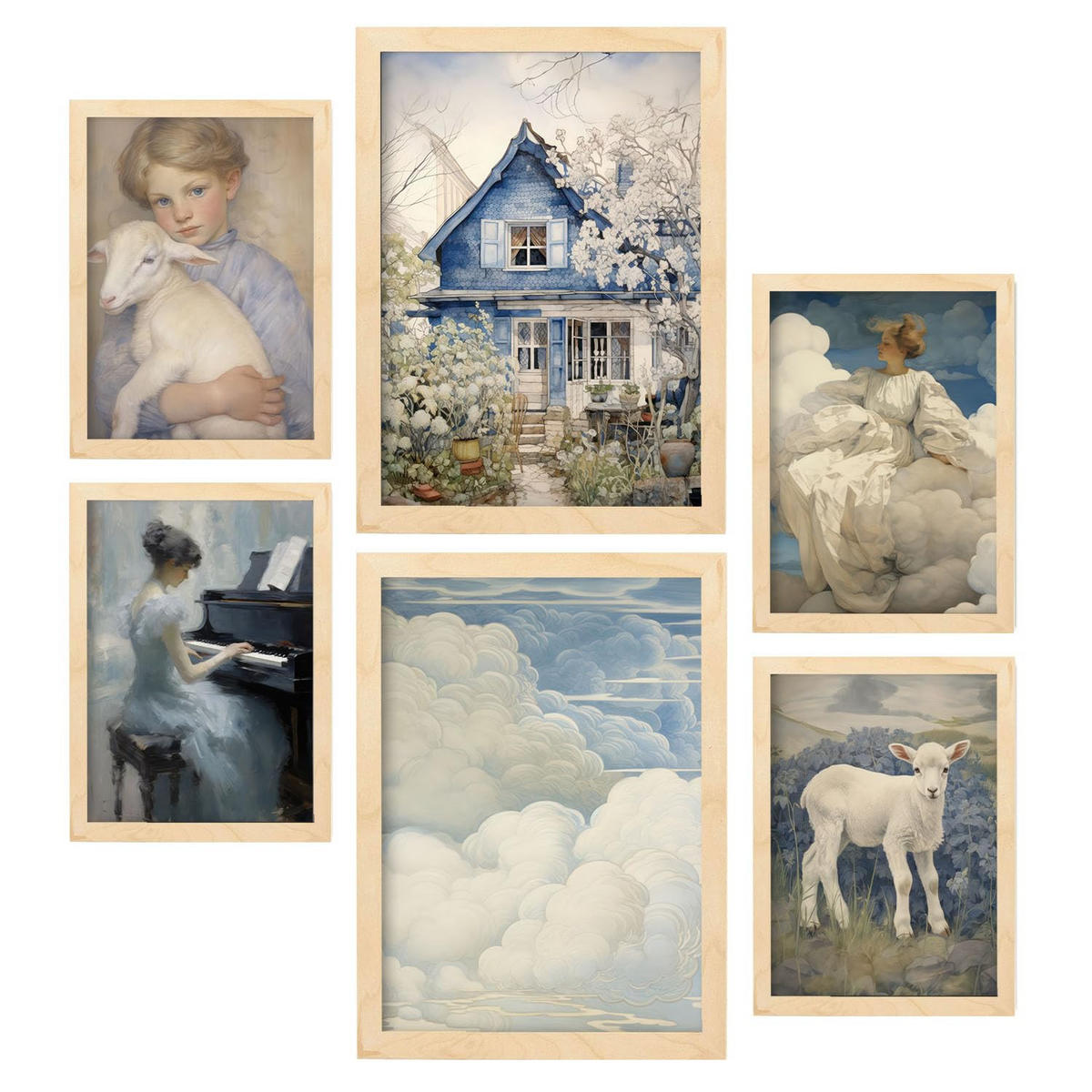 POSTER Set Mit 6 Romantischer Blau A3 & A4 Rahmen Aus Hellem Holz - Beige, Papier (29/3cm) - NacnicNacnic