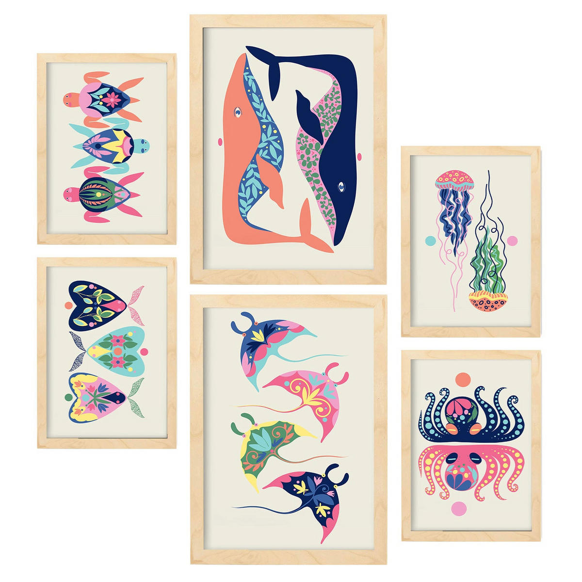 POSTER Set Mit 6 Wasserkreaturen In Tiere Zusammenfassungen A3 & A4 Rahmen Aus Hellem Holz - Beige, Papier (29/3cm) - NacnicNacnic