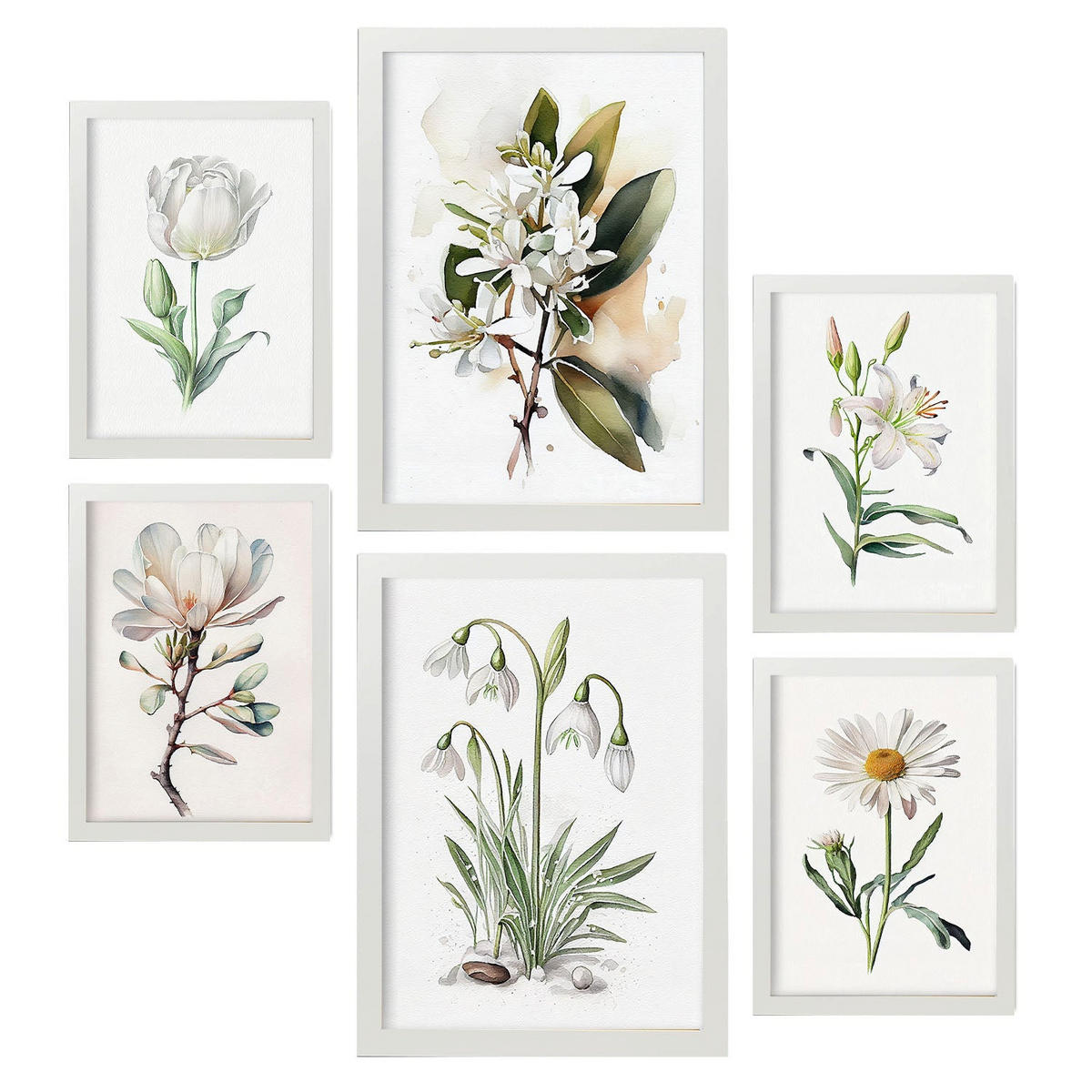 POSTER Set Mit 6 Weiße Blumen Vollfarbige Natur Und Botanikdrucke Mit Blumenmotiven Auf Reinweißen Hintergründen A3 & A4 Weißer Rahmen - Weiß, Papier (29/3cm) - NacnicNacnic