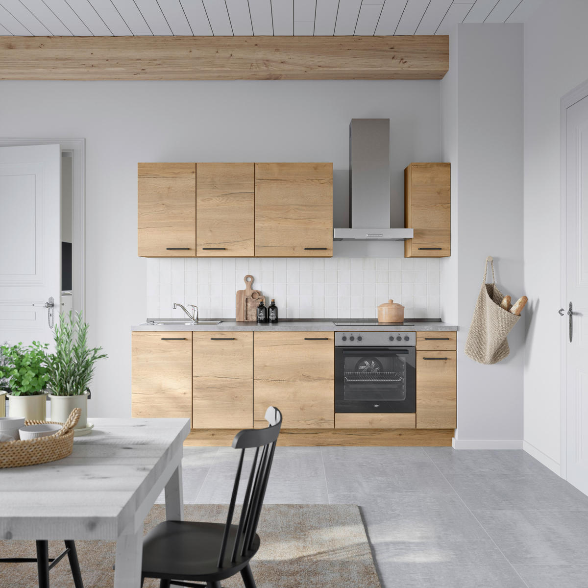 - Inkludierte Elektrogeräte: Dunstabzugshaube, Einbauherd, Geschirrspüler, Kühlschrank mit Gefrierfach, Glaskeramikkochfeld