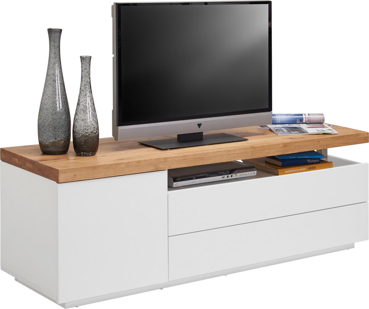 Hinter der Drehtür bewahren Sie Wohnaccessoires oder Bücher auf. Die 2 geräumigen Schubladen wissen den Stauraum gekonnt zu ergänzen und bieten Platz für Gesellschaftsspiele oder die Filmsammlung. Aktuelle Zeitschriften haben Sie im offenen Fach schnell zur Hand, in dem der TV-Receiver gut aufgehoben ist. Dieses Lowboard steht für einen organisierten Lifestyle!