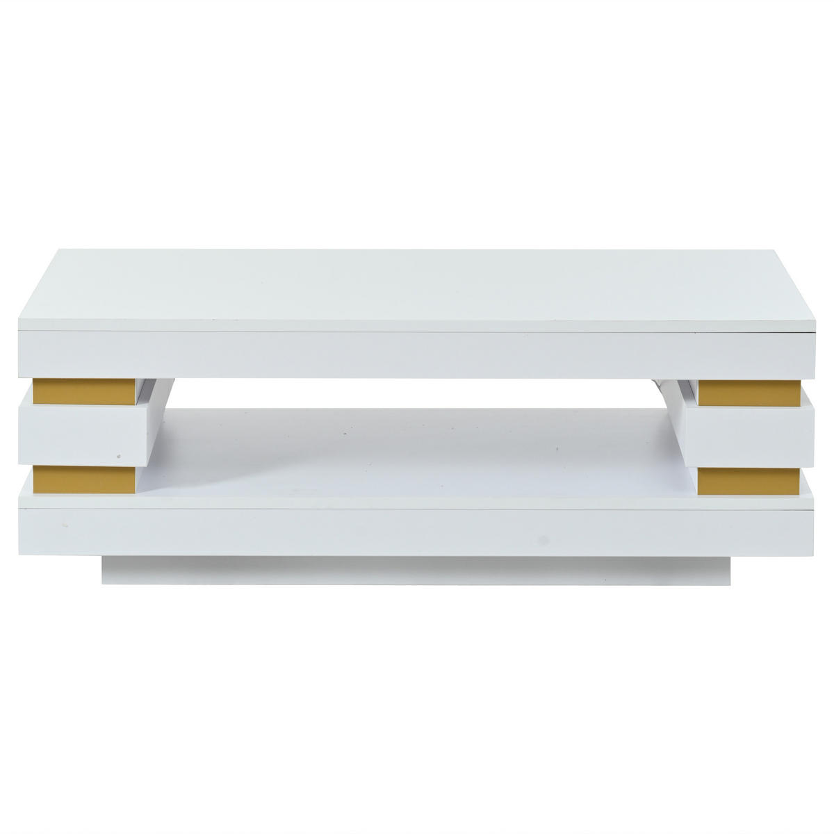 Produktübersicht:Dieser Couchtisch verbindet ein klares, modernes Erscheinungsbild mit einer eleganten Farbkombination aus Weiß und Gold. Die hochglänzende Oberfläche unterstreicht die reduzierte Formensprache, während das mittig ausgehöhlte Design dem Wohnbereich eine leichte, offene Wirkung verleiht und besonders in kleinen Räumen harmonisch wirkt.