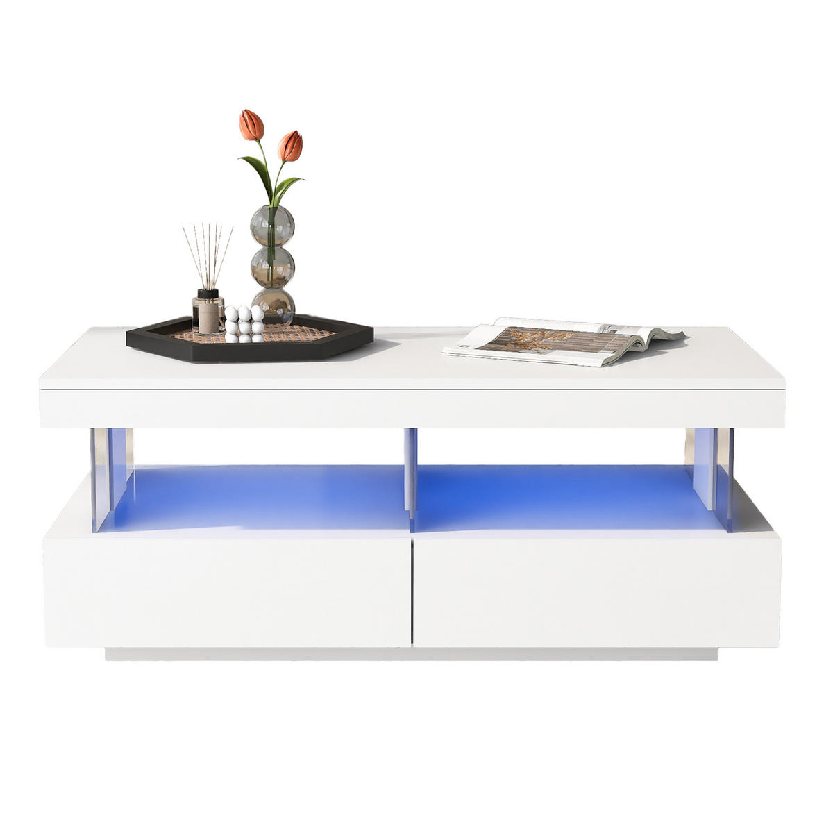 OKWISH COUCHTISCH 100/60/49,5 cm Weiß mit Hochglanz-Oberfläche und LED-Beleuchtung