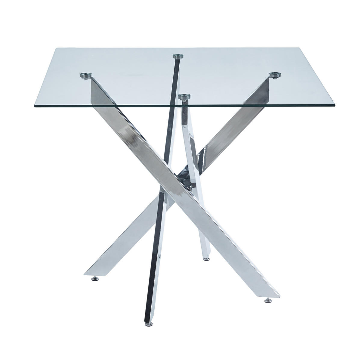 Produktübersicht:Der quadratische Esstisch wirkt durch die klare Glasplatte und das silberfarbene Metallgestell modern und leicht. Die Kombination aus transparentem Glas und glänzendem Metall bringt eine aufgeräumte, urbane Atmosphäre in Küche, Essbereich oder Wohnraum.