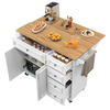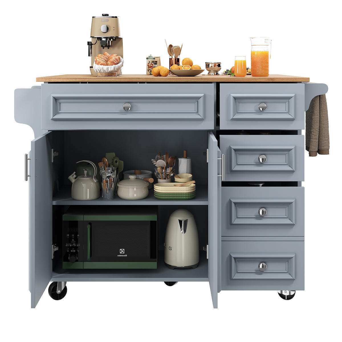 Die klappbare Tischplatte macht den Wagen besonders flexibel: platzsparend als Schrank an die Wand geklappt oder bei Bedarf als zusätzliche Arbeits- und Essfläche ausgezogen. Verstellbare Trennwände, Schubladen und ein seitliches Ablagebrett schaffen Ordnung für Küchenutensilien und unterstützen einen effizienten Arbeitsablauf.