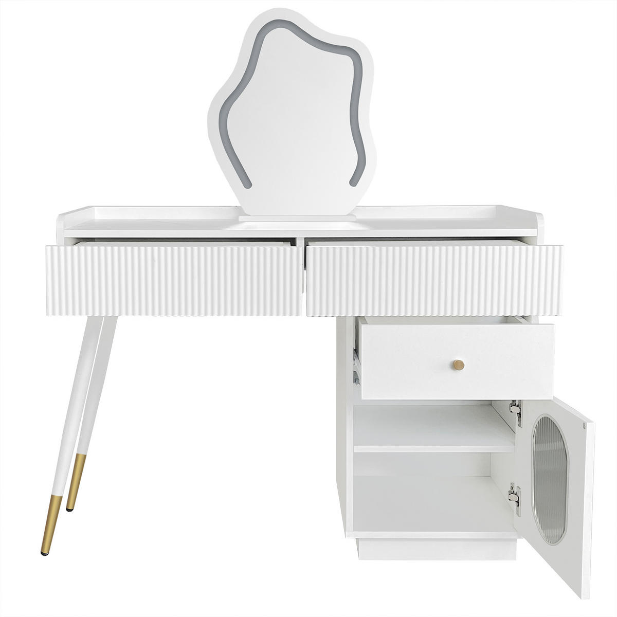 Produktübersicht:Dieser Schminktisch in Weiß verbindet eine elegante Ausstrahlung mit feinen Details. Gewellte Schubladenfronten, längsgestreifte Glastüren und Metallgriffe verleihen dem Möbel eine stilvolle, ruhige Optik. So entsteht im Schlaf- oder Ankleidebereich ein gepflegtes Ambiente mit zeitloser Note.