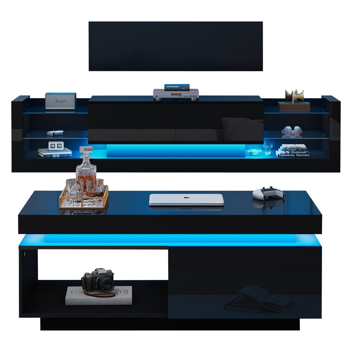 Produktübersicht:Dieser moderne Couchtisch und TV-Schrank vereint Hochglanz-Design, Funktionalität und stilvolle LED-Beleuchtung in einem Möbelstück. Die glatten, pflegeleichten Oberflächen verleihen Ihrem Wohnzimmer ein elegantes und luxuriöses Ambiente. Mit einer großzügigen Breite von 181 cm bietet der TV-Schrank Platz für Fernseher bis zu 80 Zoll, während der Couchtisch Stauraum in Form einer Schublade und offener Ablageflächen bereitstellt. Integrierte LED-Leuchten schaffen eine warme, einladende Atmosphäre und setzen Ihre Wohnzimmereinrichtung gekonnt in Szene.