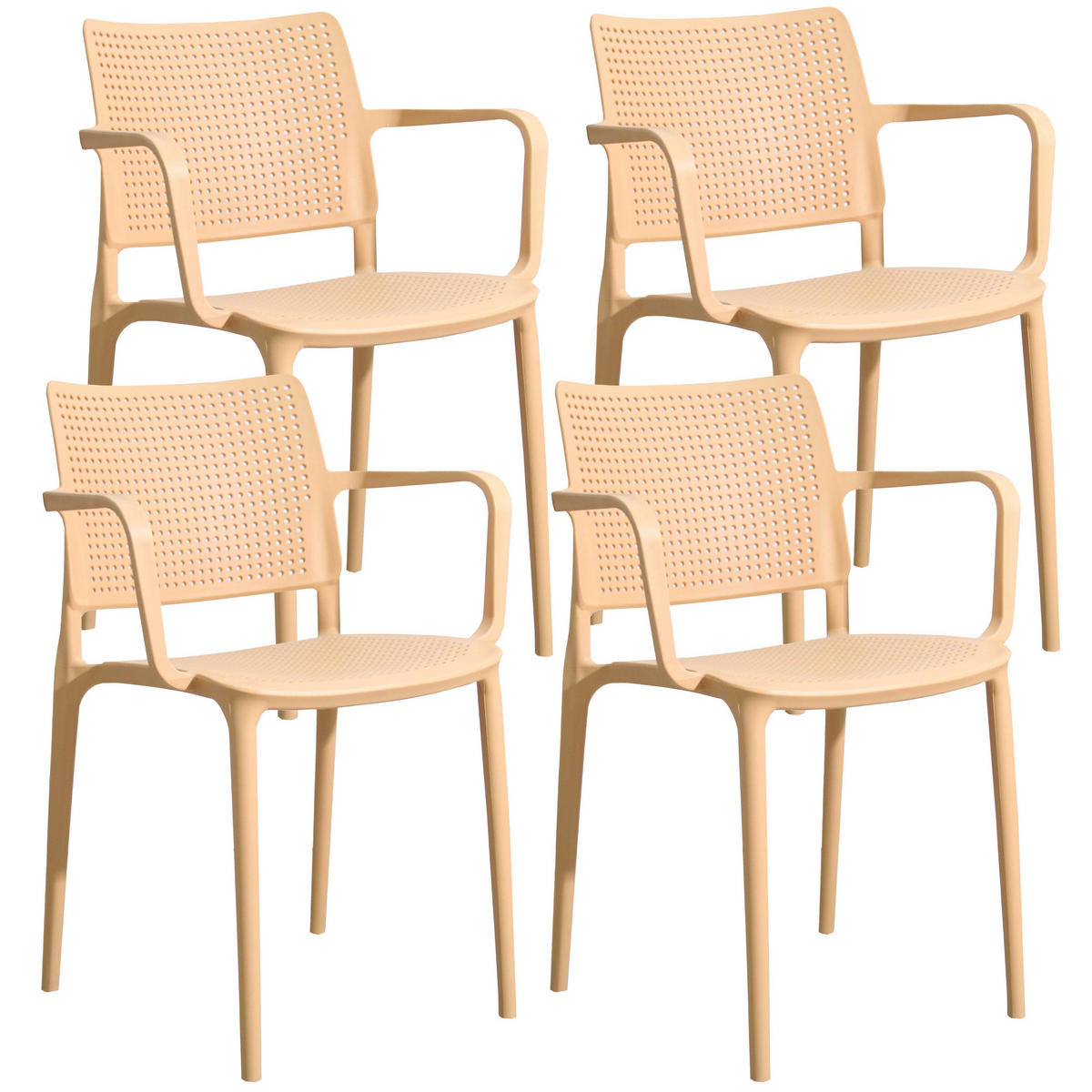 Entscheiden Sie sich für unser Set aus 4 durchbrochenen Gartenstühlen aus Polypropylen, eine ideale Wahl für den Außenbereich. Dieser Stuhl wurde speziell für starke Beanspruchung entwickelt und kann ein Gewicht von bis zu 100 kg tragen. Einer der Hauptvorteile dieses Stuhls ist seine Stapelbarkeit, sodass er leicht verstaut werden kann, wenn Sie ihn nicht benötigen. Dies ist insbesondere bei beengten Platzverhältnissen oder in professionellen Einrichtungen wie Cafés, Restaurants oder Hotels von Vorteil. Dieser aus hochwertigem Polypropylen gefertigte Stuhl bietet eine außergewöhnliche Haltbarkeit gegen schlechtes Wetter, UV-Strahlen und andere äußere Einflüsse. Es ist stoßfest, verblasst nicht und behält seine Attraktivität im Laufe der Zeit. Wir bieten verschiedene Farben für jeden Geschmack und Outdoor-Designstil an – von klassischen neutralen Tönen bis hin zu hellen, kräftigen Farben. Dieses Set aus 4 Stühlen ist nicht nur funktional und langlebig, sondern bietet auch Leichtigkeit und optimalen Komfort. Sein durchbrochenes, ergonomisches Design sorgt für eine gute Rückenunterstützung und ermöglicht angenehme Stunden im Freien: Entspannung, geselliges Essen mit Freunden oder Familienmomente sind garantiert. Mit einer Höhe von 80 cm, einer Breite von 42 cm und einer Tiefe von 55 cm bieten diese Stühle geräumige und bequeme Sitzgelegenheiten, damit Sie Ihre Zeit im Freien in vollen Zügen genießen können. Darüber hinaus ist die Sitzhöhe von 45 cm ideal für bequemes Sitzen und Aufstehen. Maße: Höhe: 80 cm, Länge: 55 cm, Breite: 42 cm, Sitzhöhe: 45 cm, Armlehnenhöhe 68 cm und Gewicht eines Stuhls: 8 kg