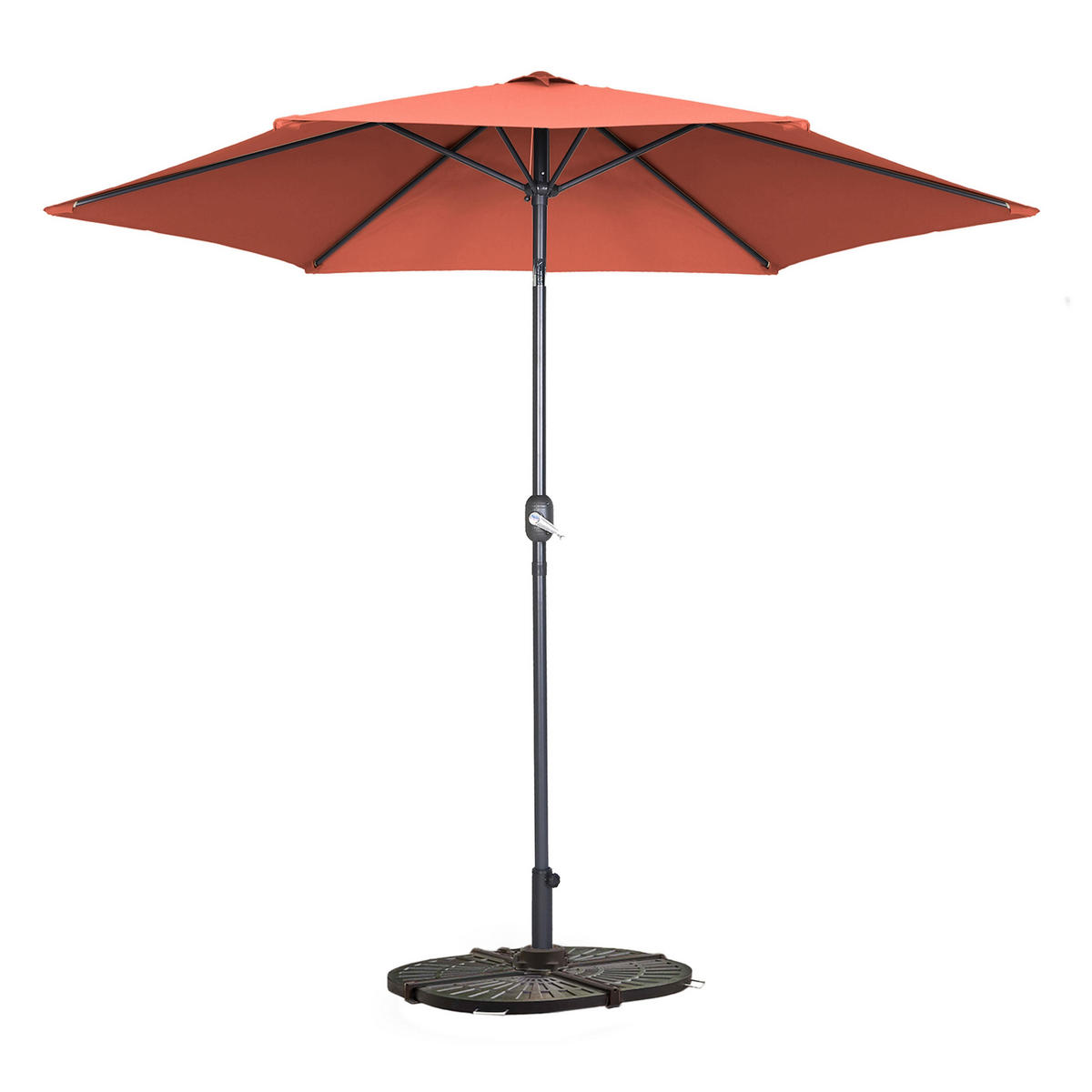 Der klappbare Standfuß und 4 beschwerte Platten werden mit dem Sonnenschirm geliefert.