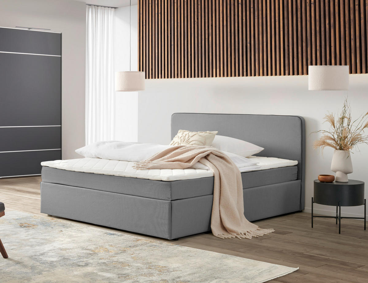 Die Boxspringmatratze mit mittlerem Härtegrad, die auf einem Lattenrost über der leeren Box liegt, sorgt für Ihr Wohlgefühl. Ein Bonellfederkern reagiert flächenelastisch auf Ihre Bewegungen. Der Komfort gestaltet sich dadurch angenehm und flexibel. Das i-Tüpfelchen ist der ca. 4 cm hohe Topper mit Schaumstoffkern. Darauf erleben Sie kuschelige Nächte, sodass Sie die Zeit stillstehen lassen möchten. Für ein entspanntes Frühstück im Bett dient das gepolsterte Kopfteil mit dunkelgrauem Keder als Rückenlehne. In diesem Boxspringbett (ca. 160 x 200 cm) in Grau starten Sie bestens ausgeruht und gut gelaunt in den Tag!
