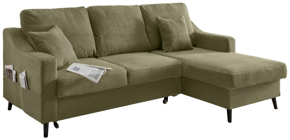 ECKSOFA Olivgrün Cord Zierkissen, Rückenkissen, Bettkasten, Schlaffunktion, Rücken echt, Stauraum, Liegefläche im Originalstoff