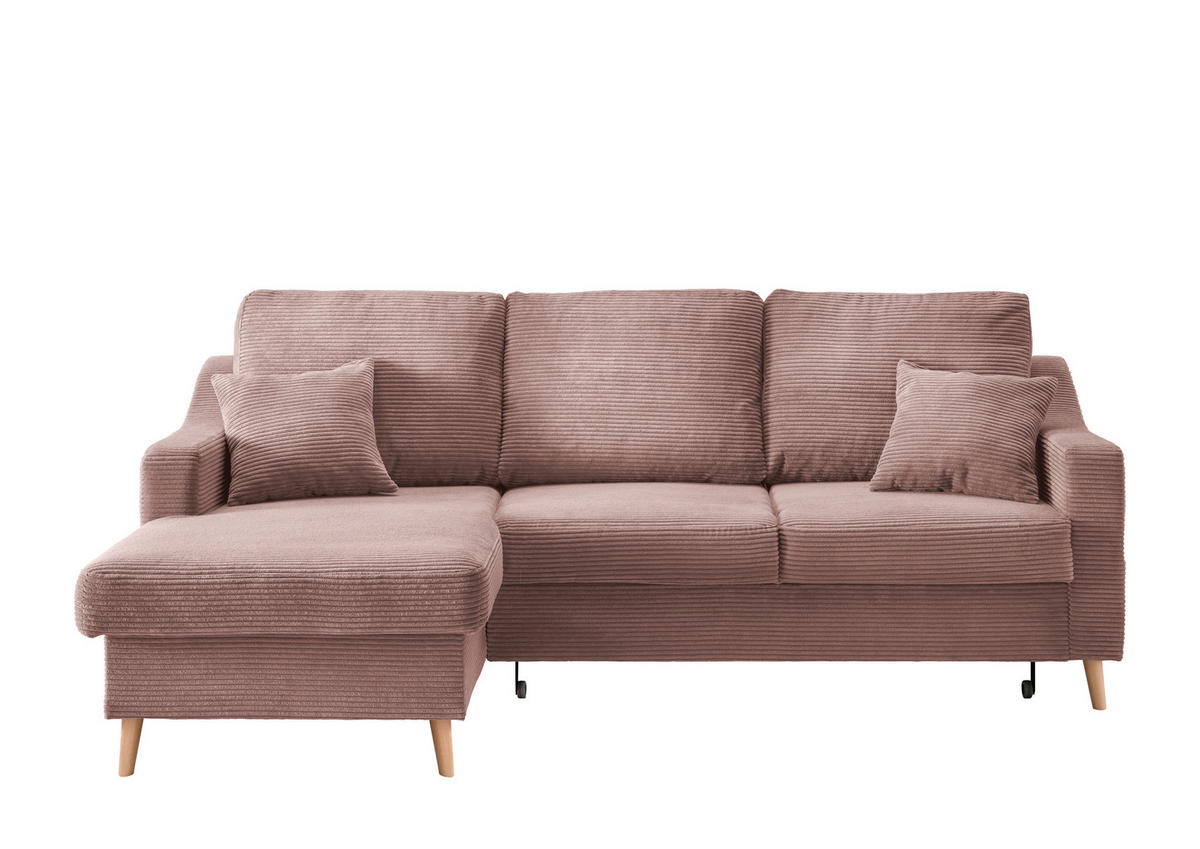 ECKSOFA Rosa Cord Zierkissen, Rückenkissen, Bettkasten, Schlaffunktion, Rücken echt, Stauraum, Liegefläche im Originalstoff