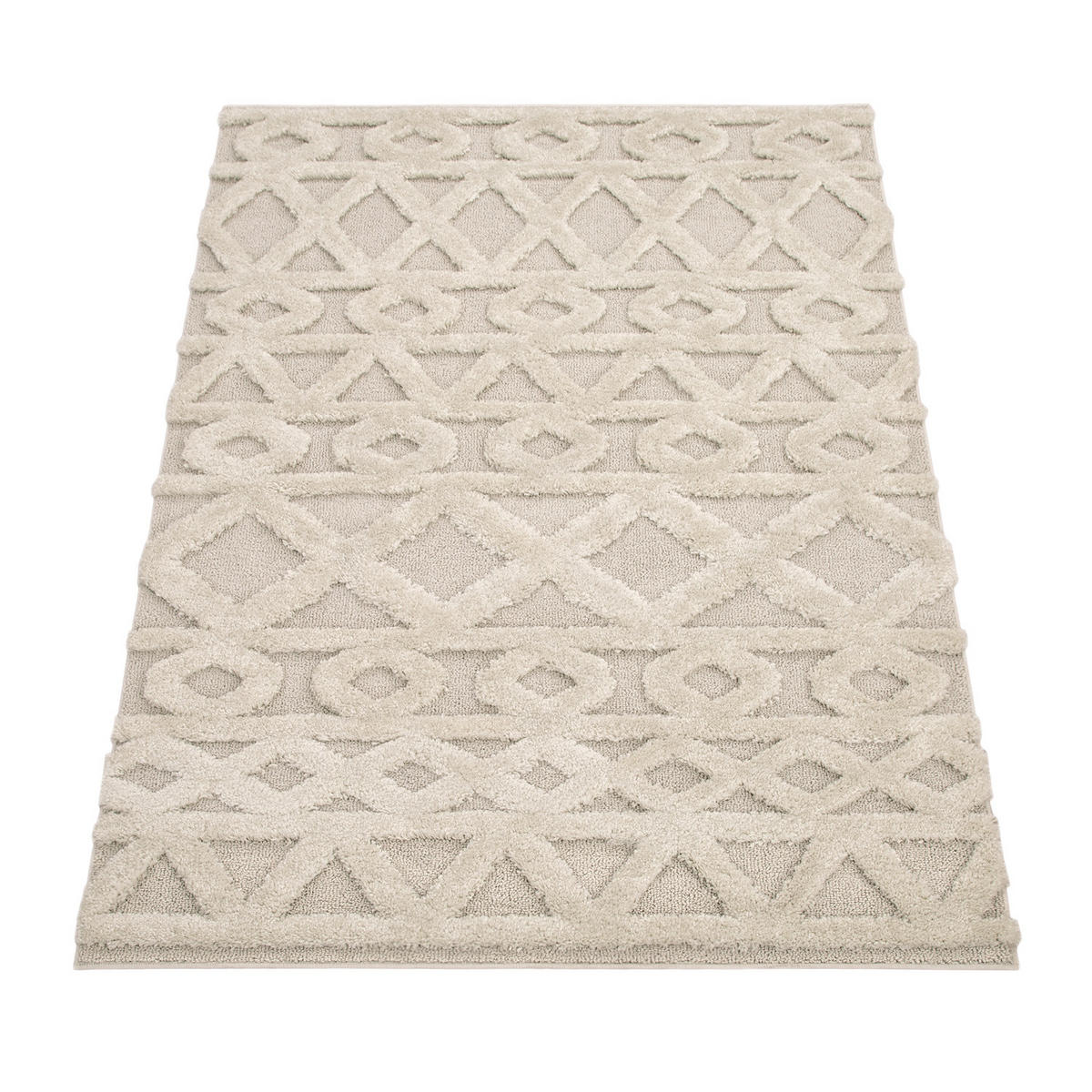 Sie möchten sich gerne so richtig entspannen und einfach mal die Seele baumeln lassen? Sie suchen das gewisse Etwas, das Ihnen in Ihrem Lieblingszimmer noch fehlt? Dann werden Sie von diesen trendigen Hochflor-Teppichen begeistert sein, denn sie kombinieren nicht nur moderne Farben mit einem angesagten Design, sie sind auch traumhaft weich und flauschig. Die hochwertig gearbeiteten Wohnaccessoires lassen sich dank des hellen Beigetones mit jedem Einrichtungsstil kombinieren und sorgen mit ihrem Rautenmuster im Ethno-Stil für ein besonders heimeliges Ambiente. Tauchen Sie Ihre gestressten Füße in den wolkenweichen Flor und genießen Sie Ihr neues Lieblingsstück. Niemand möchte sich beim Entspannen große Sorgen um Schadstoffe oder Gedanken um aufwändige Reinigungen machen müssen. Deshalb haben wir uns für die Herstellung unserer Shaggys auf den Werkstoff Polypropylen verlassen, einen wahren Alleskönner unter den Textilien. Die enorm robuste Oberfläche ist nicht nur langlebig, sondern auch besonders pflegeleicht, sodass Missgeschicke schnell verziehen werden. Nach STANDARD 100 by OEKO-TEX® sind die Teppiche außerdem nachweislich frei von Schadstoffen.