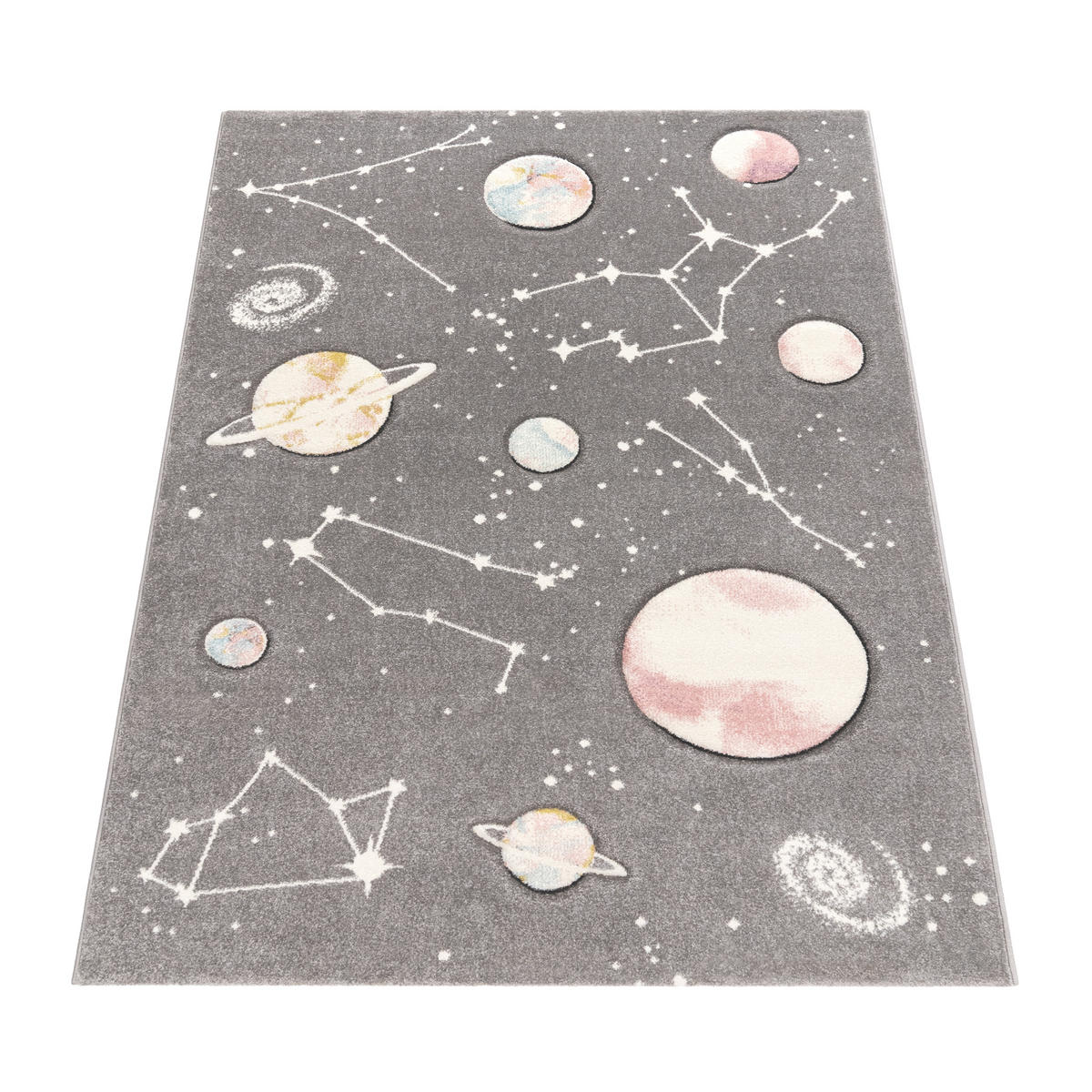 Traumhafter Nachthimmel für Ihre kleinen Astronomen! Zauberhaft und friedlich nimmt dieser spannende Kinderteppich Ihre Kleinen mit auf eine interessante Reise durch die Sterne. Kreativ melierte und pastellfarbene Planeten heben sich stilvoll vom tief grauen Firmament ab, während die strahlenden Sternbilder den kleinen Forscher in Ihren Kindern ans Tageslicht bringen. Egal, ob tagsüber beim fantasievollen Spielen oder abends beim Schlafengehen - dieser wunderschöne Teppich ist der Star im Kinderzimmer! Damit Sie Ihre Kinder beruhigt auf Ihrer Reise zu fremden Planeten alleine lassen können, nutzen wir für die Herstellung des hochwertigen Kurzflor-Teppichs ausschließlich nach STANDARD 100 by OEKO-TEX® geprüfte, vollkommen schadstofffreie Materialien. Zu 100 % aus vielseitigem Polypropylen hergestellt, ist der Spielteppich darüber hinaus pflegeleicht, nahezu unverwüstlich und übersteht spielend auch mal ein Missgeschick. Der gemütlich hohe Flor rundet das verspielte Gesamtpaket kunstvoll ab, verwöhnt mit der außergewöhnlichen Haptik die kleinen Kinderfüße und macht den Teppich zur idealen Spielwiese!
