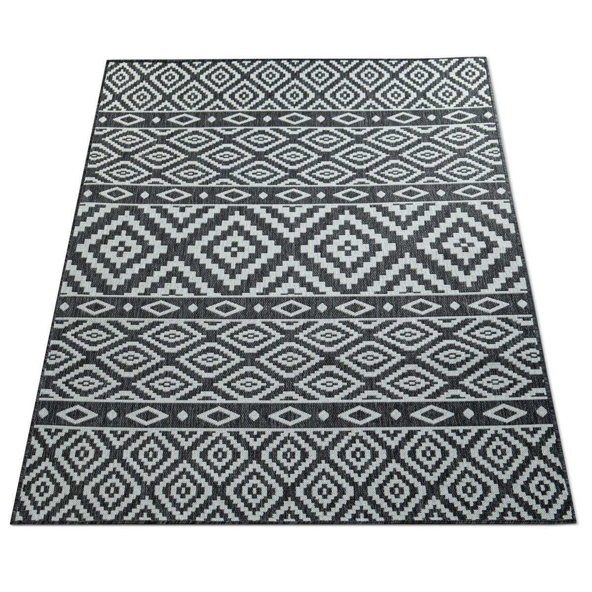Verleihen Sie Ihrem Balkon oder Ihrer Terrasse einen atemberaubenden Hauch von skandinavischem Stil: Rustikal und doch modern, verbindet dieser trendige Teppich für den Innen- und Außenbereich auf eindrucksvolle Weise trendige, minimalistische Farben und organisches skandinavisches Design. Der monochrome Schwarz-Weiß-Kontrast wirkt bewusst unaufdringlich und minimalistisch, während das authentische Rautenmuster einen Hauch von nordischer Ruhe und Gemütlichkeit in Ihren Außenbereich bringt. Genießen Sie die warmen Monate in einer außergewöhnlichen Atmosphäre! Damit Sie lange Freude an dem ganz besonderen Esprit haben und das flachgewebte Meisterwerk auch bei schlechtem Wetter ruhig auf Balkon oder Terrasse liegen lassen können, verwenden wir für die Herstellung des Teppichs nur robuste und vor allem wetterfeste Materialien. Das Garn aus 100% gewebtem Polypropylen ist erstaunlich pflegeleicht und einfach zu handhaben. Auch um Schadstoffe müssen Sie sich keine Sorgen machen, das Prüfsiegel STANDARD 100 by OEKO-TEX® garantiert schadstofffreien Komfort.