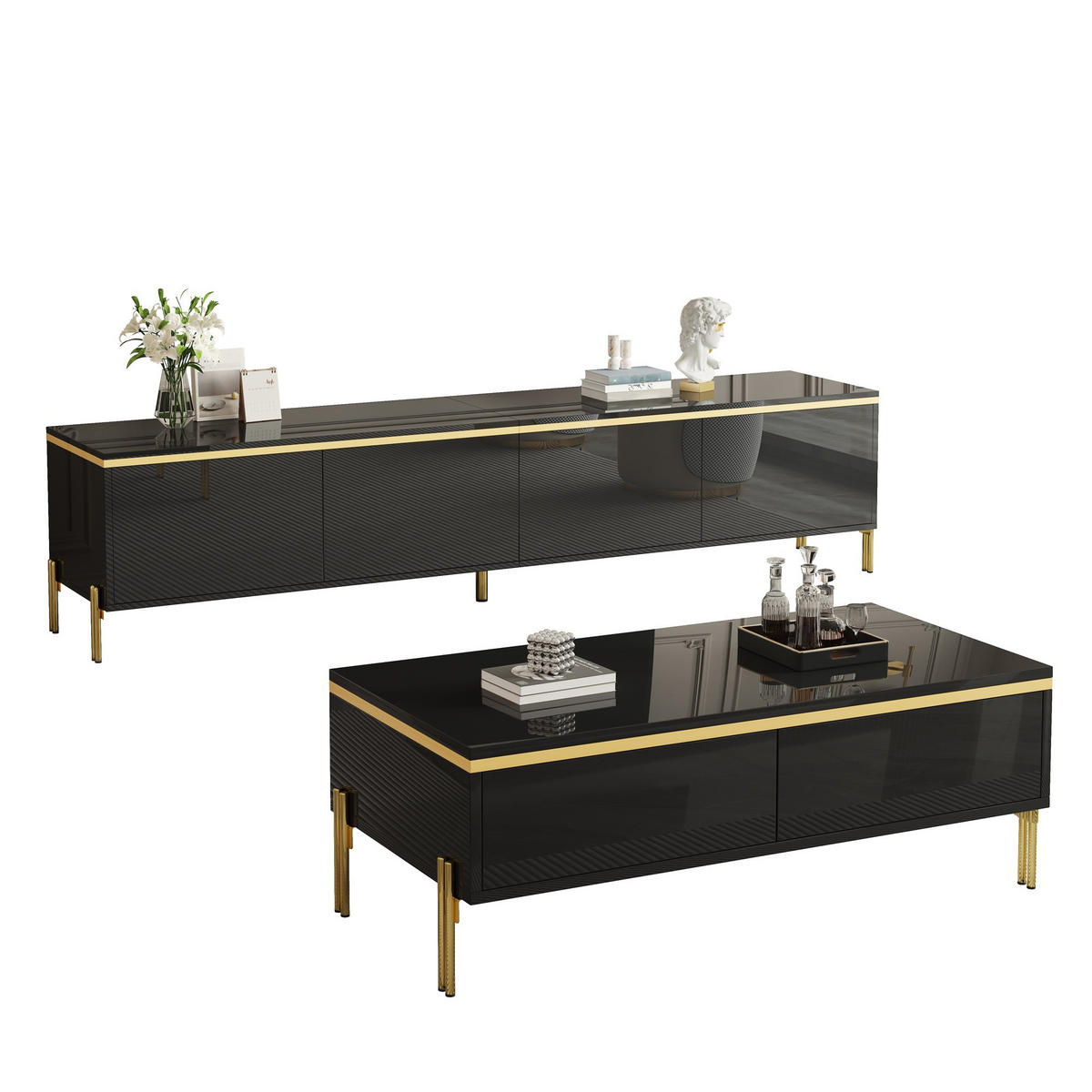 PANGIVO TV-SCHRANK & COUCHTISCH Schwarz 170/38/50 + 100/50/36 cm Hochglanz mit Stauraum