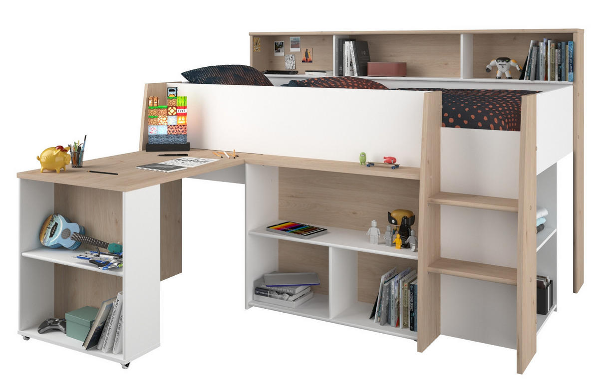 Dieses kompakte Hochbett eignet sich perfekt für Kinder- und Jugendzimmer mit wenig Platz. In seinem durchdachten, modernen Design macht das Modell "Lukas" in weiß und Eiche japanisch eine optimale Figur. Dank der exzellenten Materialauswahl ist es pflegeleicht und besonders strapazierfähig und somit haltbar. Zum Modell "Lukas" gehören insgesamt zehn Ablagefächer und als eingebautes Highlight ein auf Rollen ausziehbarer Schreibtisch dazu. Es verspricht mit der Liegefläche von 90 x 200 cm erholsame Stunden, kann mit 80 kg belastet werden und kommt in Kombination mit einer Einlegeplatte, so dass kein Lattenrost erforderlich ist.