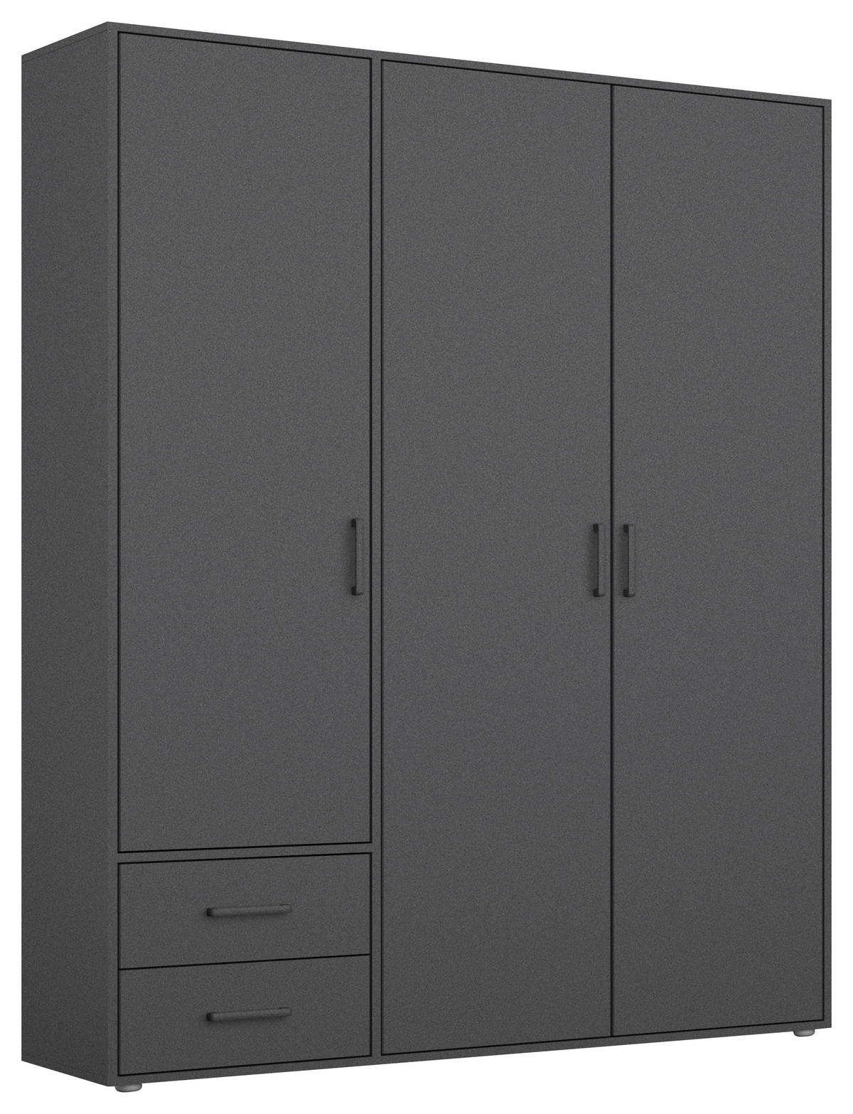 Der Schrank (Breite: ca. 140 cm) punktet auch in Sachen Stauraum: Hinter 3 Drehtüren und in 2 Schubladen befindet sich jede Menge Platz für Ihre Garderobe. Auf den 3 verstellbaren Einlegeböden stapeln Sie Shirts, Pullover oder Leggings ordentlich aufeinander. An der Kleiderstange bewahren Sie Hemden, Blusen oder Kleider knitterfrei auf. Bei diesem Drehtürenschrank in Grau und Eichefarben profitieren Sie von exzellenter Qualität "made in Germany"!
