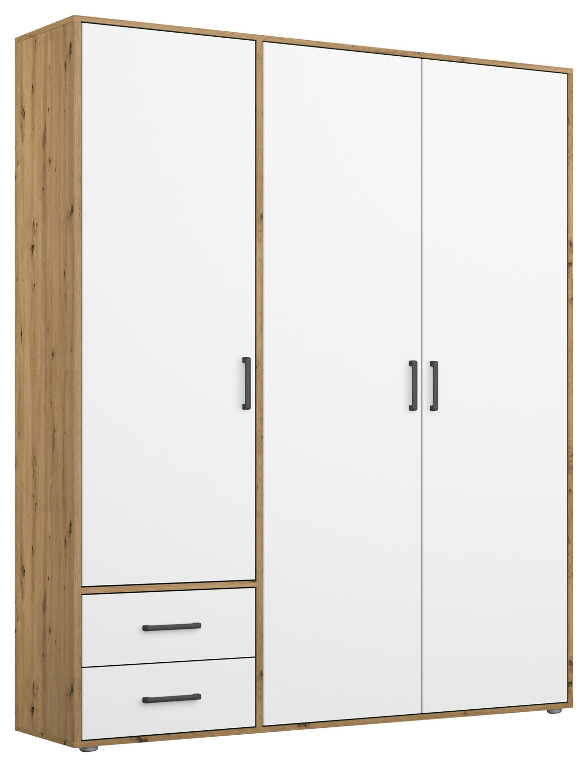 Mit diesem MID.YOU Drehtürenschrank in Weiß und Eichefarben schaffen Sie ein modernes Ambiente im Schlafzimmer. Das strahlende Weiß setzt einen spannenden Kontrast zu den natürlichen Artisan-Eichefarben und zaubert so stilvollen Charme in die vier Wände. Die grauen Bügelgriffe unterstreichen die stylische Optik zusätzlich.