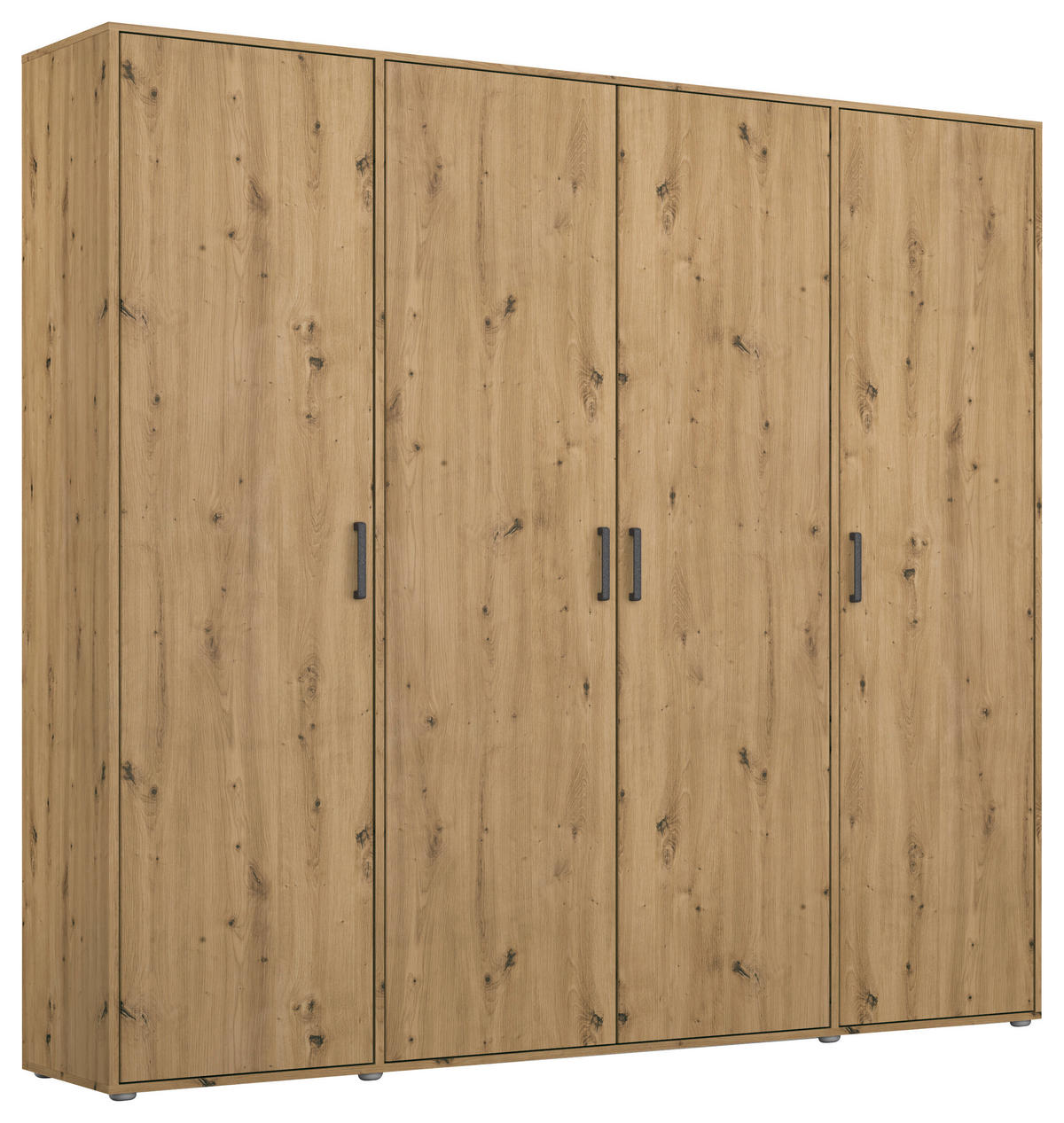Der Schrank (Breite: ca. 187 cm) punktet auch in Sachen Stauraum: Hinter 4 Drehtüren befindet sich jede Menge Platz für Ihre Garderobe. Auf den 7 verstellbaren Einlegeböden stapeln Sie Shirts, Pullover oder Leggings ordentlich aufeinander. An der Kleiderstange bewahren Sie Hemden, Blusen oder Kleider knitterfrei auf. Bei diesem Drehtürenschrank in Eichefarben profitieren Sie von exzellenter Qualität "made in Germany"!