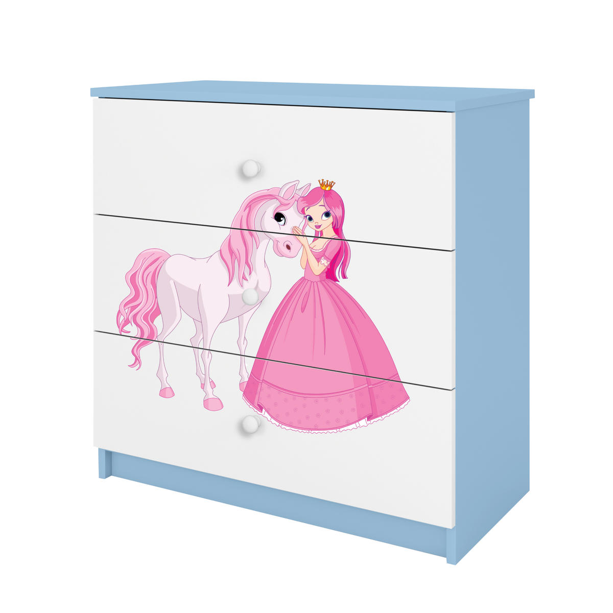 BABYDREAMS Kinderkommode mit Motiv Prinzessin Pferd in der Farbe Blau – Praktische Lösung für das Kinderzimmer.