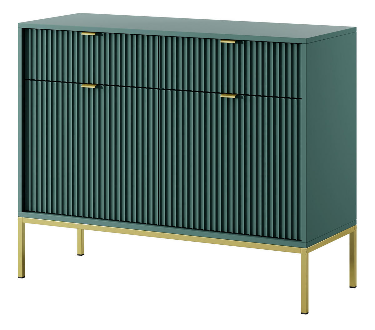 Kommode Kioto 104 cm – geriffelte Eleganz in moderner Ausführung Die geriffelten Fronten aus MDF sind eine Augenweide – sie verleihen der Kommode einen einzigartigen, dekorativen Charakter. Die goldenen Griffe aus gebürstetem Aluminium unterstreichen den exklusiven Stil und verleihen ihr einen Hauch von subtiler Eleganz. Dank 2 Schubladen auf Kugelführungen und 2 Schränken mit selbstschließenden Türen sorgt das Möbelstück für eine perfekte Organisation des Raums. Eine funktionale Lösung für das Wohnzimmer, das Schlafzimmer oder einen stilvollen Flur.