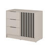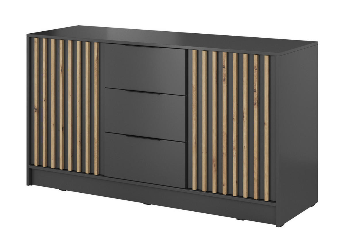 Die Kommode Stilo in eleganter Graphitfarbe mit vertikalen Lamellen im Dekor Eiche Artisan ist ein starker Akzent für ein modernes Interieur.