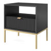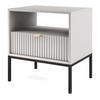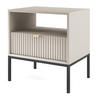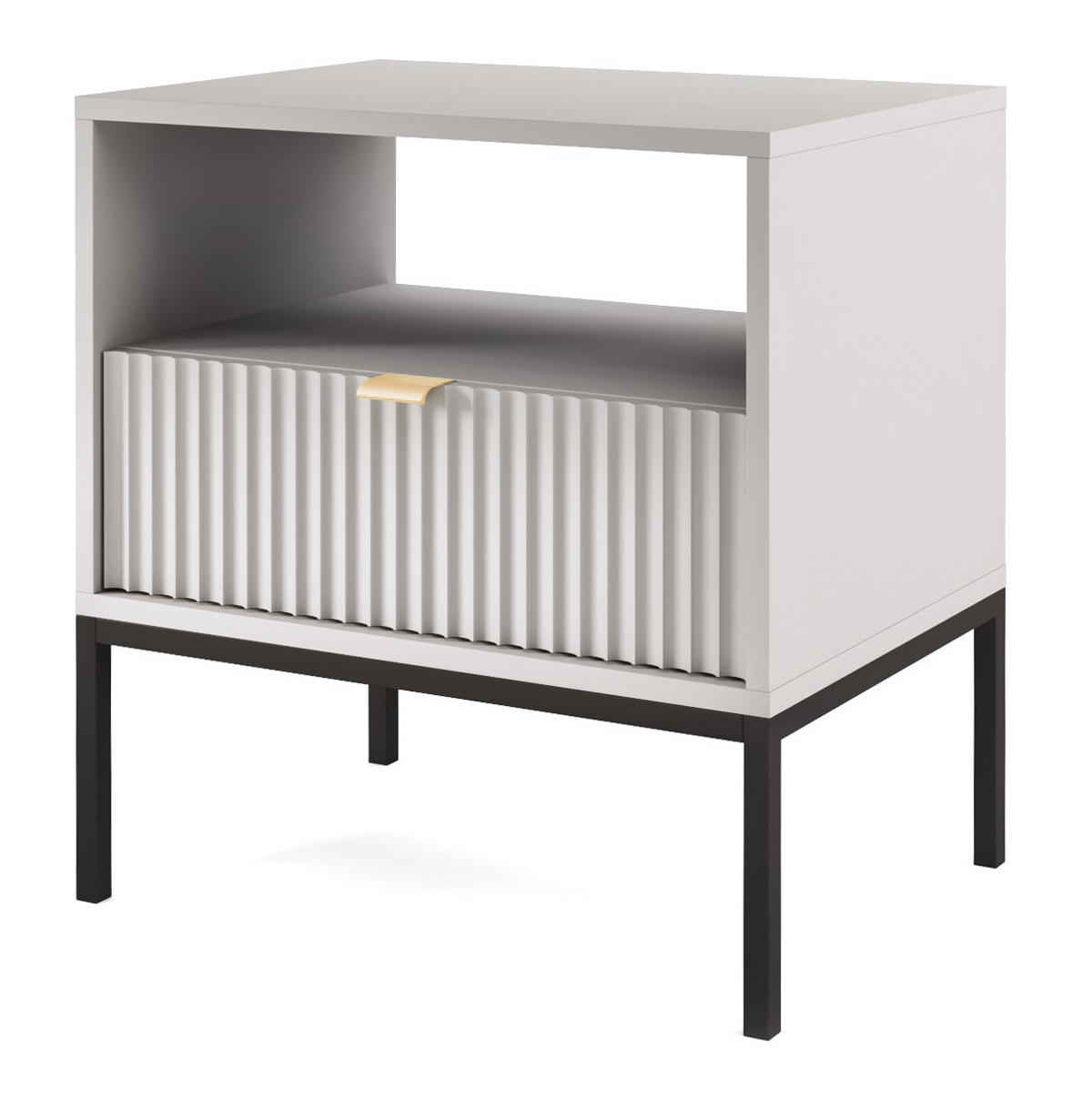 Nachttisch Kioto 54 cm – ein elegantes Detail für ein modernes Schlafzimmer Die geriffelte Front in Kombination mit dem goldenen Griff verleiht diesem Tisch einen einzigartigen Stil. Dieses Möbelstück verbindet auf perfekte Weise Dekorativität mit Funktionalität – es eignet sich hervorragend als Ablage für eine Lampe, ein Buch oder Kleinigkeiten, die Sie immer griffbereit haben möchten. Die stabile Konstruktion auf einem Metallgestell unterstreicht nicht nur den Charakter der Kioto-Kollektion, sondern garantiert auch Langlebigkeit. Dank seiner kompakten Abmessungen lässt sich der Tisch leicht in verschiedene Einrichtungen integrieren – sowohl im Schlafzimmer als auch in einem modernen Flur oder Arbeitszimmer.