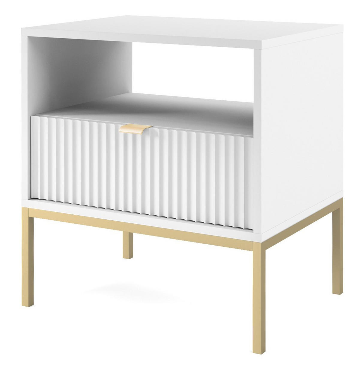 Nachttisch Kioto 54 cm – ein elegantes Detail für ein modernes Schlafzimmer Die geriffelte Front in Kombination mit dem goldenen Griff verleiht diesem Tisch einen einzigartigen Stil. Dieses Möbelstück verbindet auf perfekte Weise Dekorativität mit Funktionalität – es eignet sich hervorragend als Ablage für eine Lampe, ein Buch oder Kleinigkeiten, die Sie immer griffbereit haben möchten. Die stabile Konstruktion auf einem Metallgestell unterstreicht nicht nur den Charakter der Kioto-Kollektion, sondern garantiert auch Langlebigkeit. Dank seiner kompakten Abmessungen lässt sich der Tisch leicht in verschiedene Einrichtungen integrieren – sowohl im Schlafzimmer als auch in einem modernen Flur oder Arbeitszimmer.