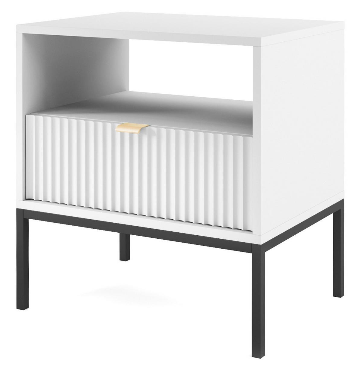 Nachttisch Kioto 54 cm – ein elegantes Detail für ein modernes Schlafzimmer Die geriffelte Front in Kombination mit dem goldenen Griff verleiht diesem Tisch einen einzigartigen Stil. Dieses Möbelstück verbindet auf perfekte Weise Dekorativität mit Funktionalität – es eignet sich hervorragend als Ablage für eine Lampe, ein Buch oder Kleinigkeiten, die Sie immer griffbereit haben möchten. Die stabile Konstruktion auf einem Metallgestell unterstreicht nicht nur den Charakter der Kioto-Kollektion, sondern garantiert auch Langlebigkeit. Dank seiner kompakten Abmessungen lässt sich der Tisch leicht in verschiedene Einrichtungen integrieren – sowohl im Schlafzimmer als auch in einem modernen Flur oder Arbeitszimmer.
