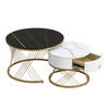 Dieser modulare Couchtisch vereint ästhetische Marmoroptik mit warmen Goldakzenten und durchdachter Funktionalität. Das Set besteht aus zwei unterschiedlich großen Tischen, die sich elegant ineinander verschachteln lassen: der große Tisch bietet eine