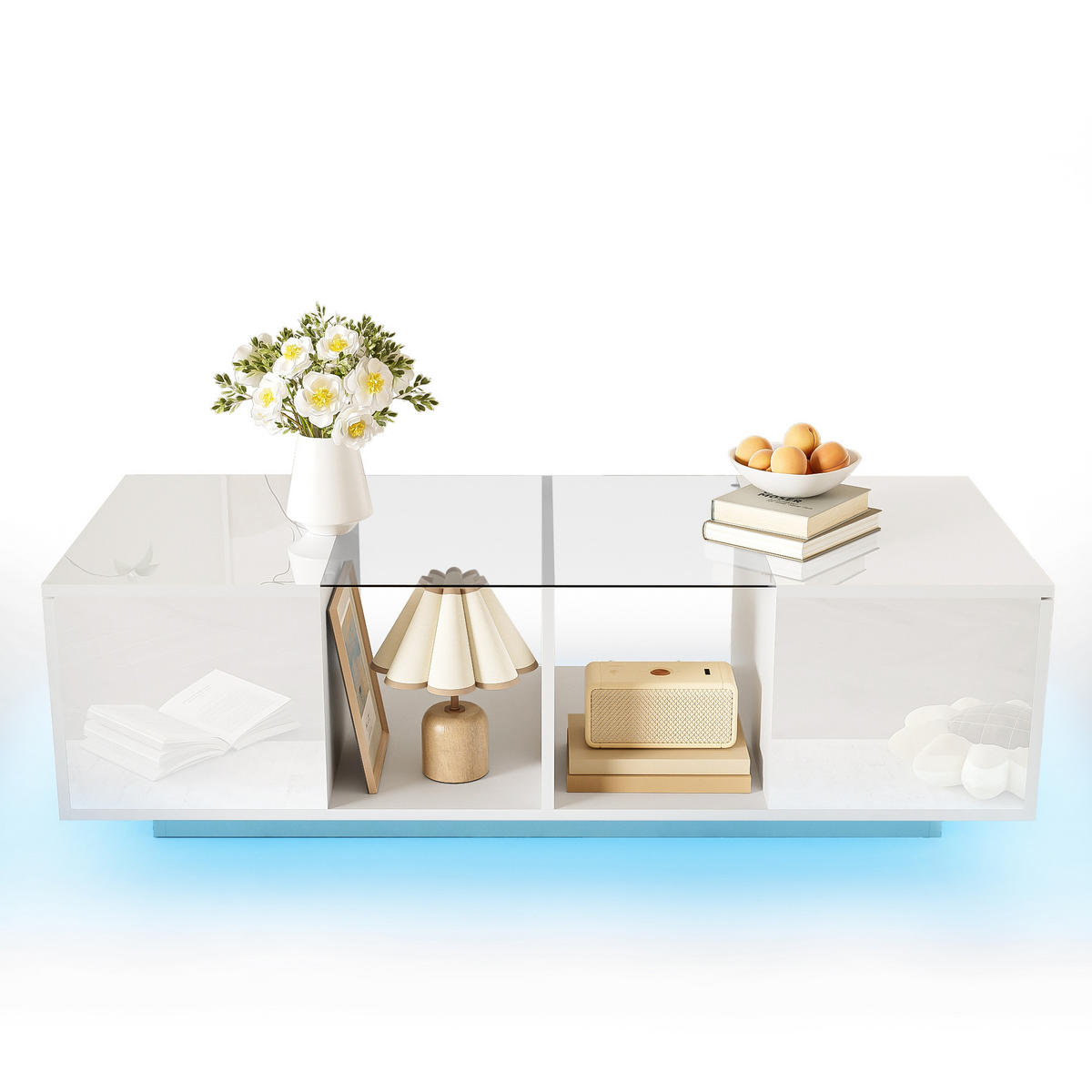 Der Couchtisch ist als eleganter Mittelpunkt im Wohnzimmer konzipiert: großzügige Ablagefläche, praktischer Stauraum und stimmungsvolle LED-Beleuchtung in einem sorgfältig verarbeiteten Möbelstück. Bitte beachten Sie, dass es aufgrund von Lichtverhältnissen