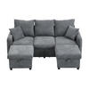 formstabil bleibt. Praktisch ist der integrierte Stauraum: Im Sofa befinden sich zwei verdeckte Metall-Schubladenkörbe, zusätzlich bieten die Hocker ein Staufach – ideal, um Decken, Zeitschriften oder Fernbedienungen ordentlich zu verstauen. Die Konstruktion