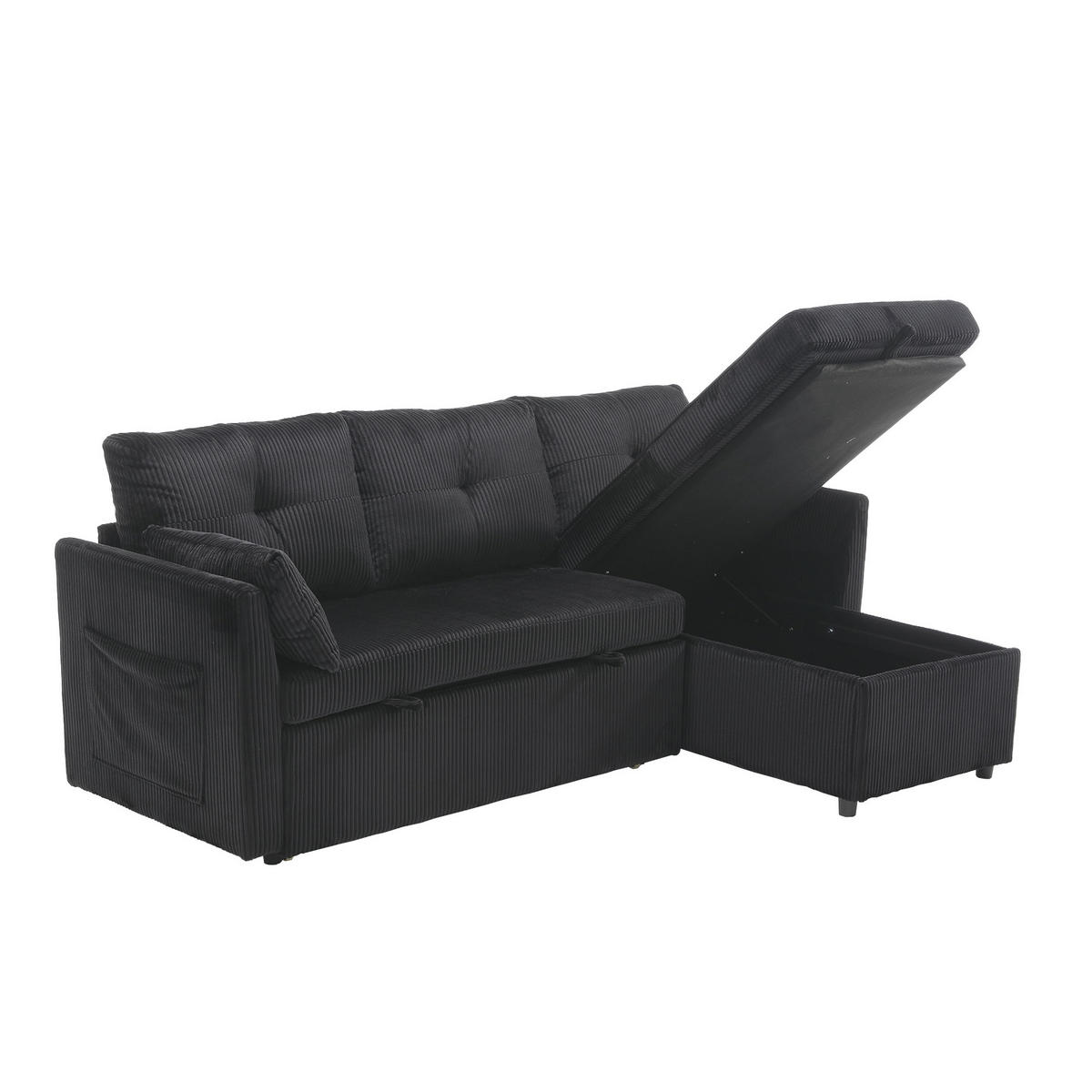 alltagstauglich ist der verdeckte Stauraum unter den Sitzen: Decken, Kissen oder andere Wohnaccessoires lassen sich schnell verstauen, damit der Raum aufgeräumt bleibt. Seitliche Ablagefächer sorgen zusätzlich dafür, dass kleine Dinge wie Fernbedienung